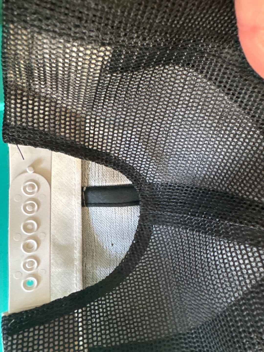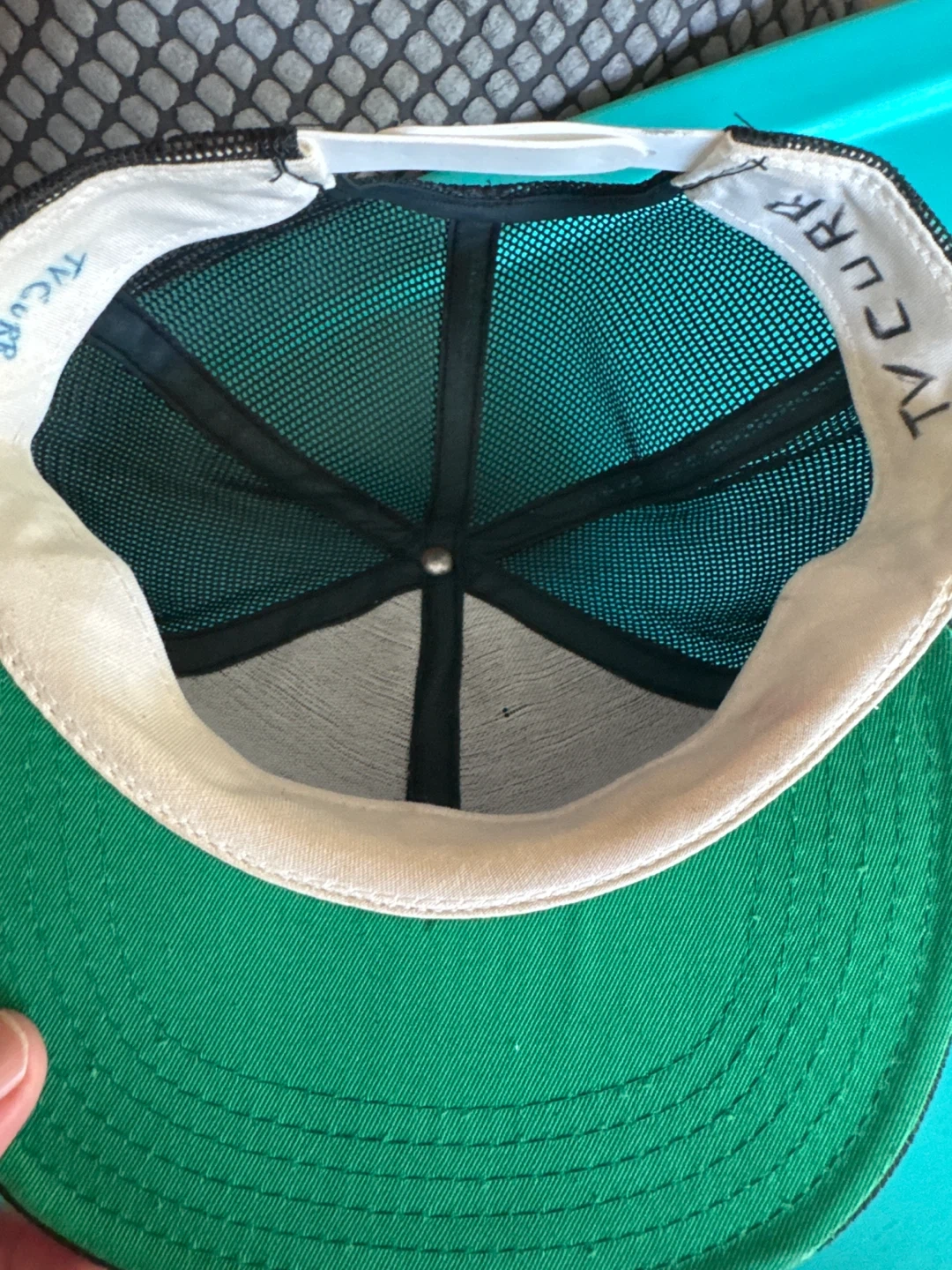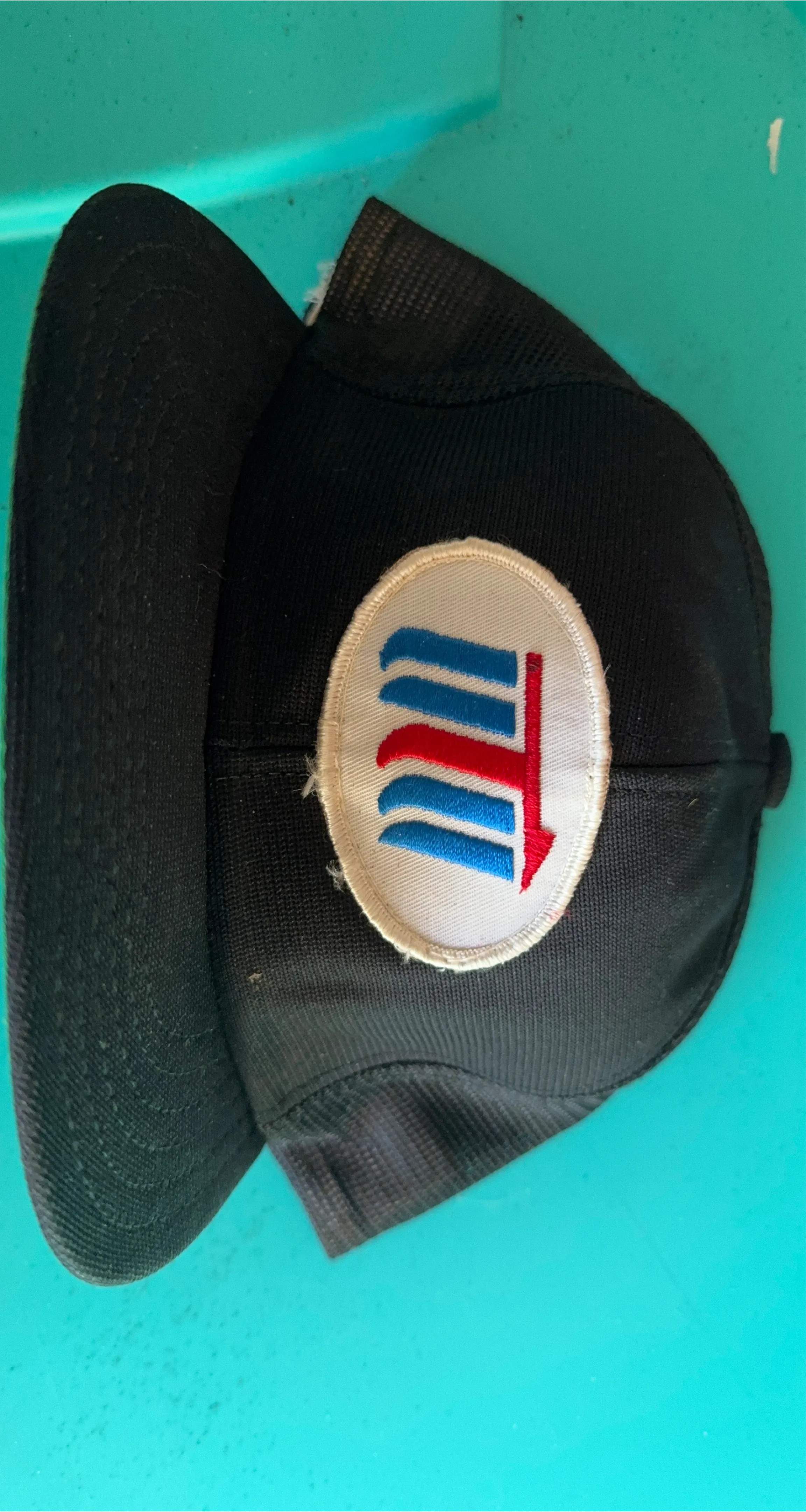 This vintage black trucker hat has a circular patch with blue and red stripes and a red downward arrow. The back features a mesh design for breathability. The inner band is white with a embroidered patch on it. It's an adjustable snapback style.