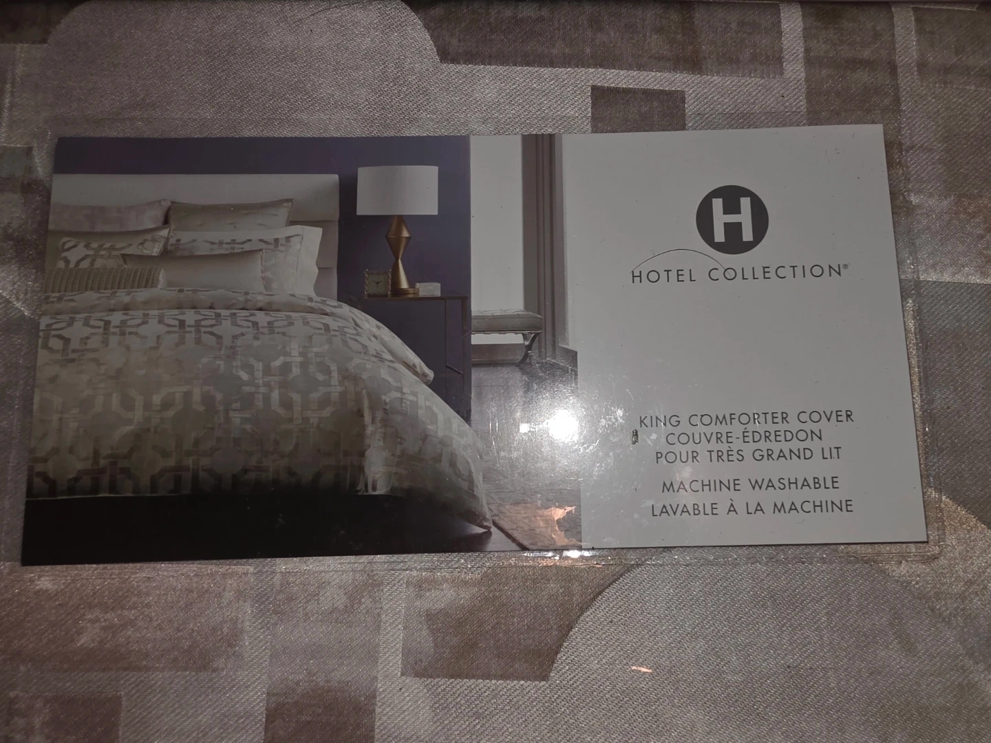 This is a Hotel Collection King Comforter Cover in a casual luxury, contemporary style. It's machine washable. The dimensions are 279 cm x 244 cm (110 in x 96 in).