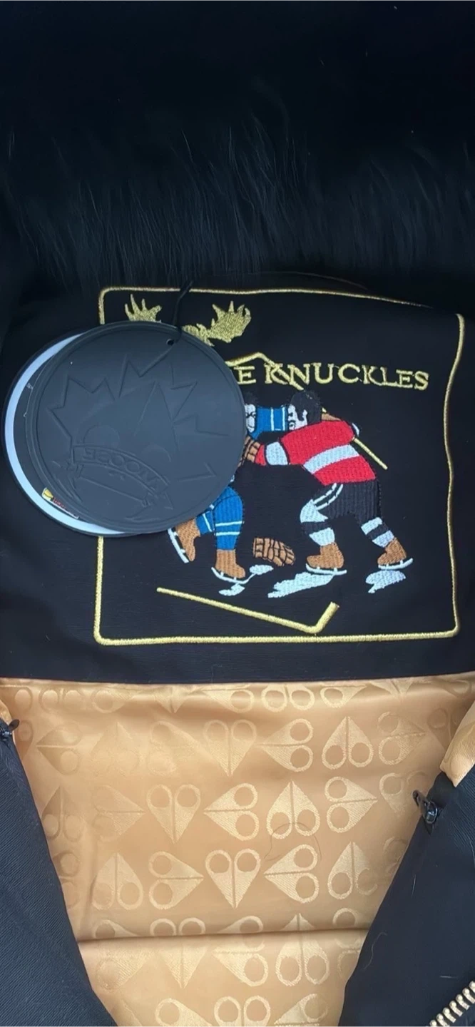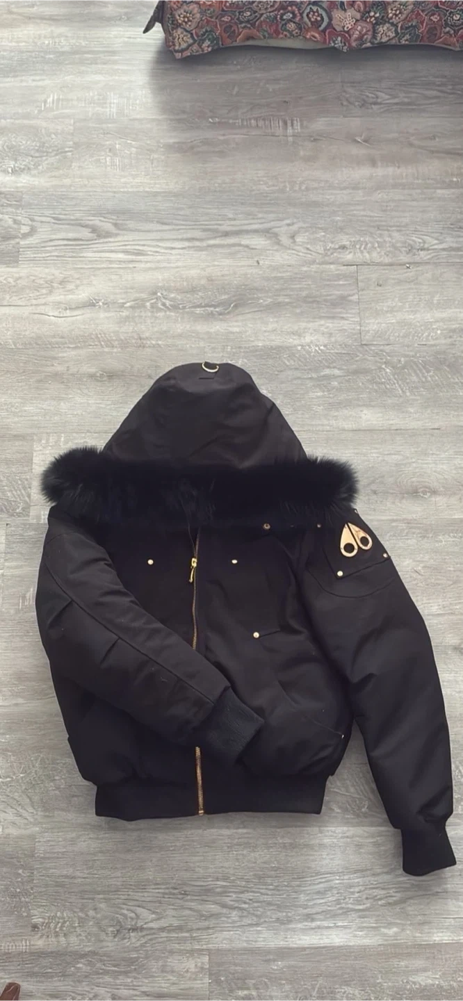 Warm black Moose Knuckles bomber jacket. It features gold hardware and a detachable fur-lined hood. The lining has a gold pattern with the Moose Knuckles logo. Size M.