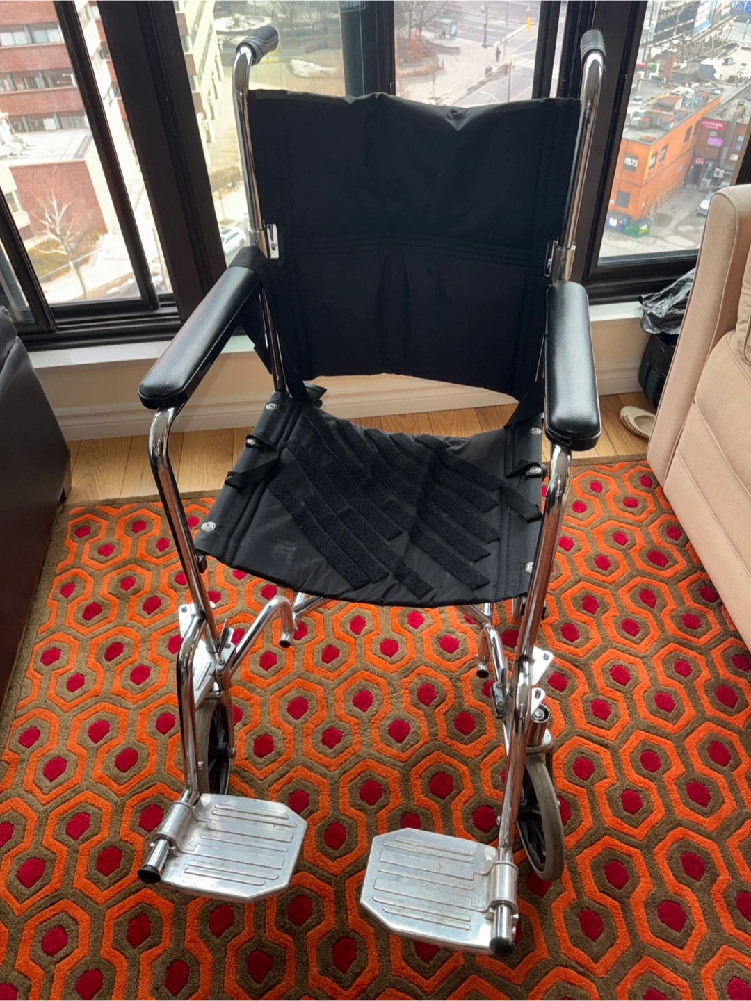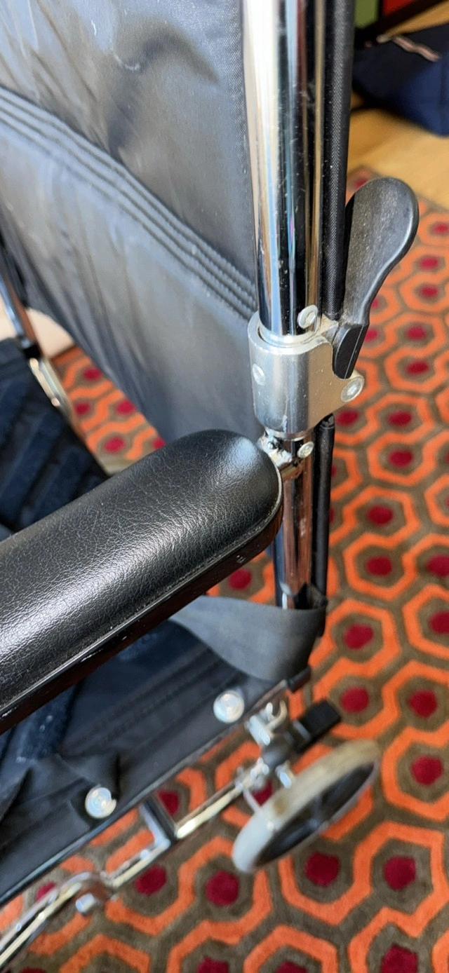 This is a well used item, and it is missing the seat cushion. However, the wheel chair still works smoothly. It is a bit dirty from use over time. Cash accepted, Cashless payment.