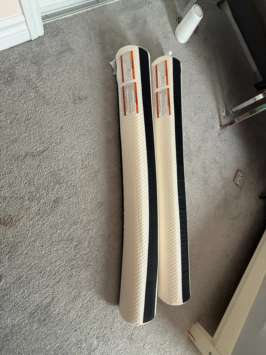 Set of two adjustable bed frame rails. They're designed to attach to most bed frames. Rails are beige with black accent strips. Covers are machine washable