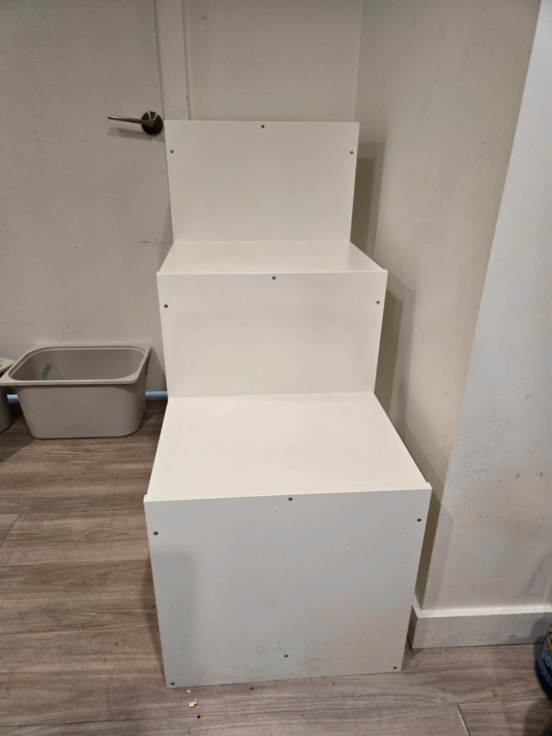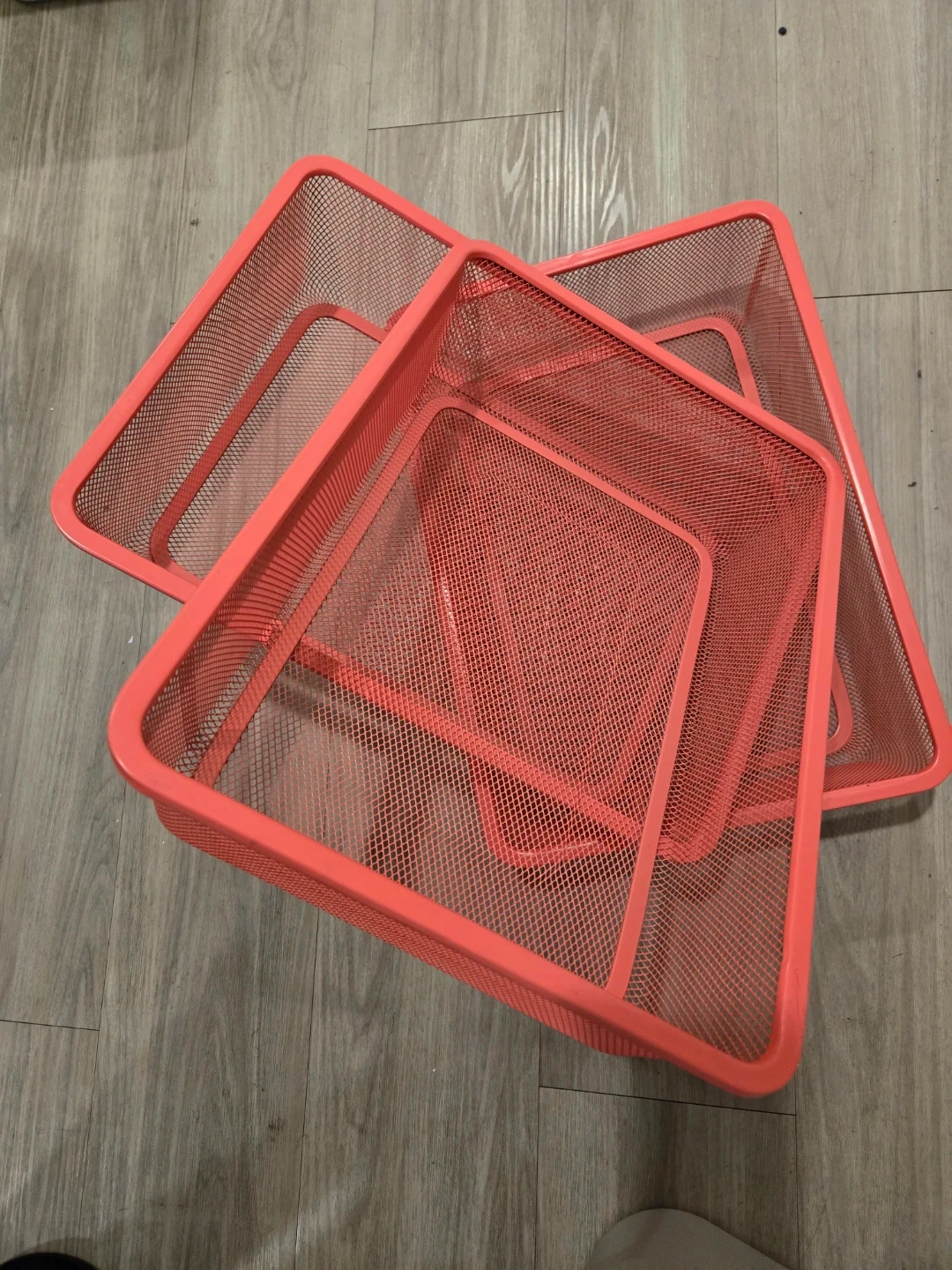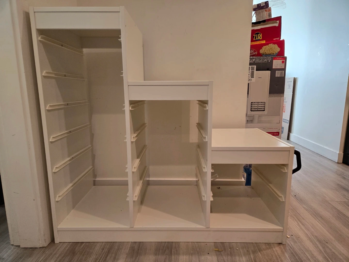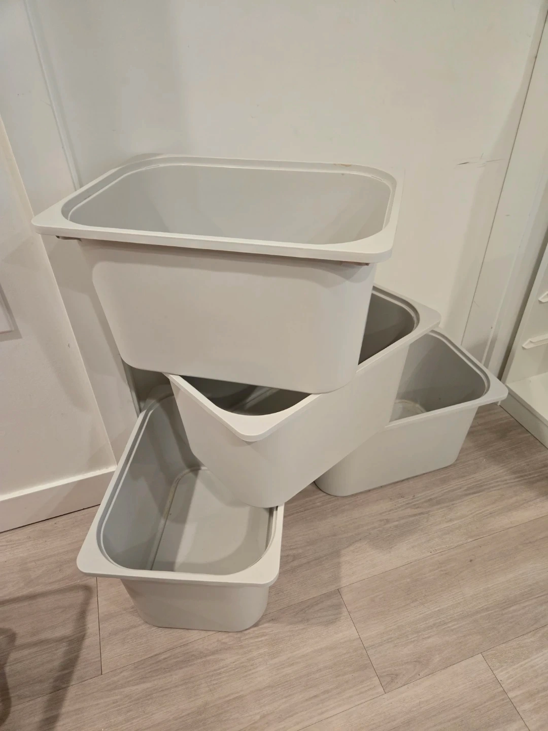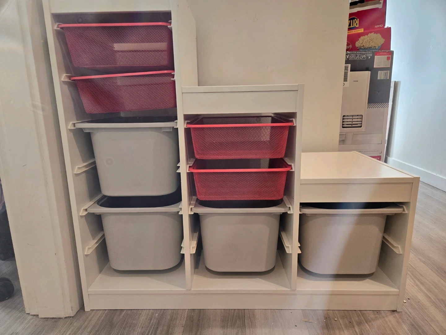 This is a white storage unit with several grey bins and pink mesh baskets. It's ideal for organizing toys or general kids items. The unit is modular and can be configured in different ways. It offers ample space for storage needs!