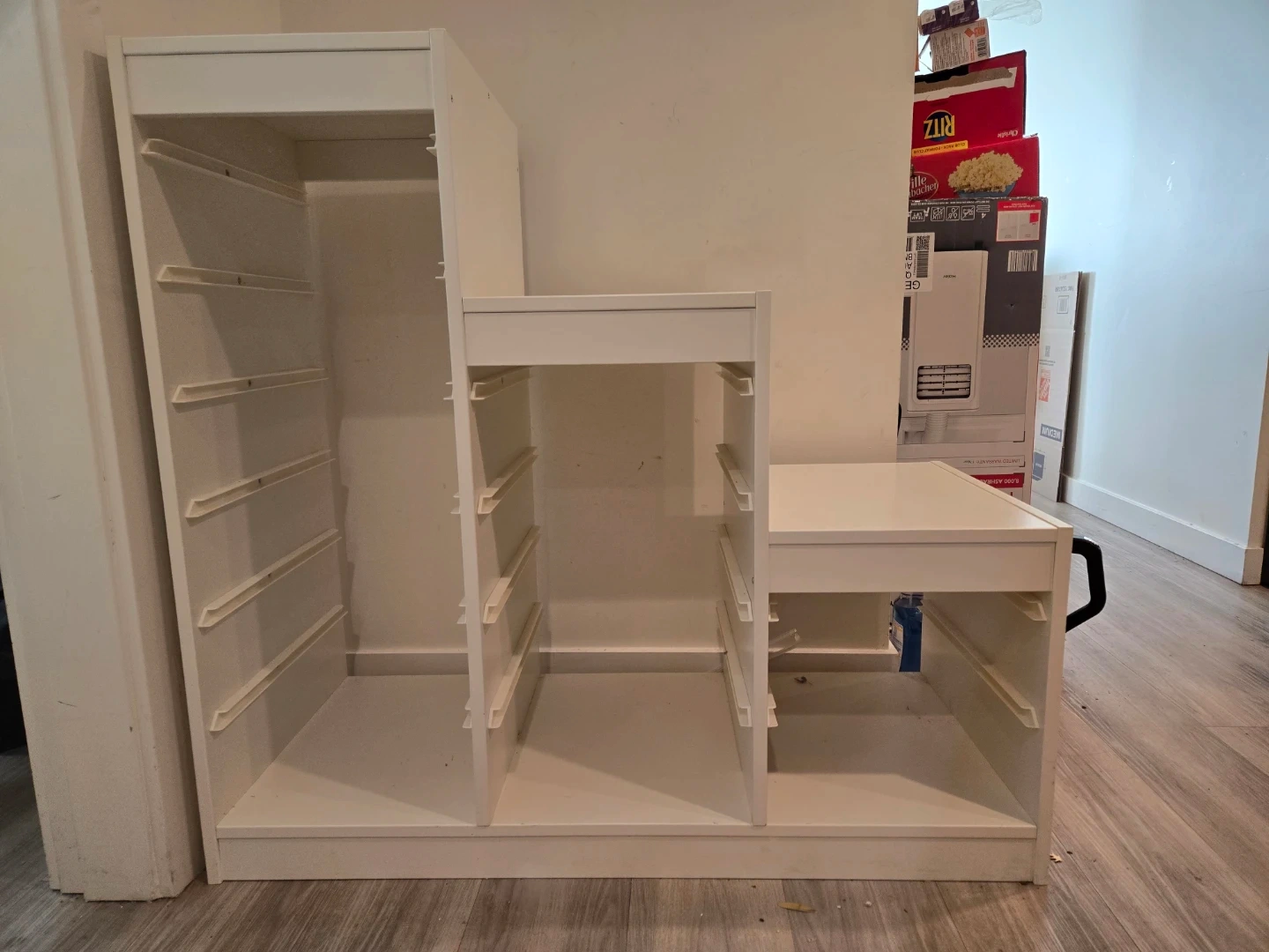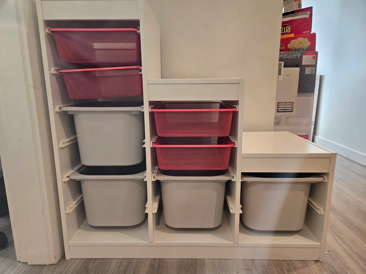 This is a white storage unit with several grey bins and pink mesh baskets. It's ideal for organizing toys or general kids items. The unit is modular and can be configured in different ways. It offers ample space for storage needs!