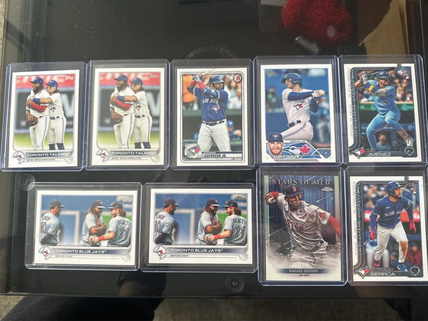 Collection of Topps baseball cards featuring Toronto Blue Jays players like Vladimir Guerrero Jr., Danny Jansen, and Leo Jimenez, along with a Rafael Devers card. Includes multiple 'Toronto Talent' cards.