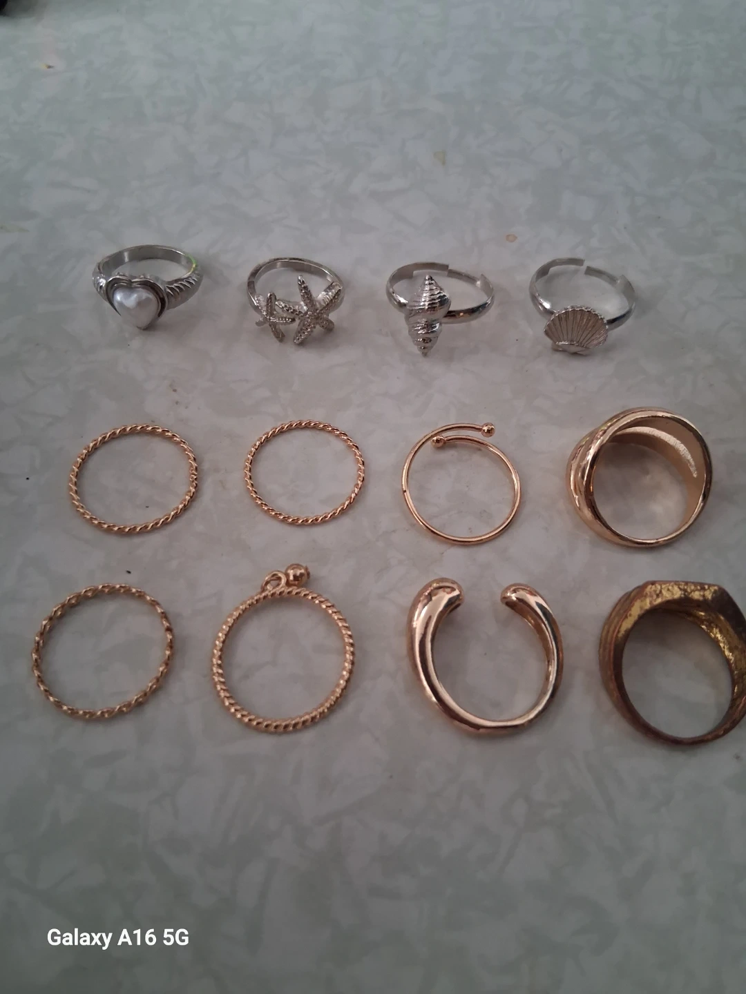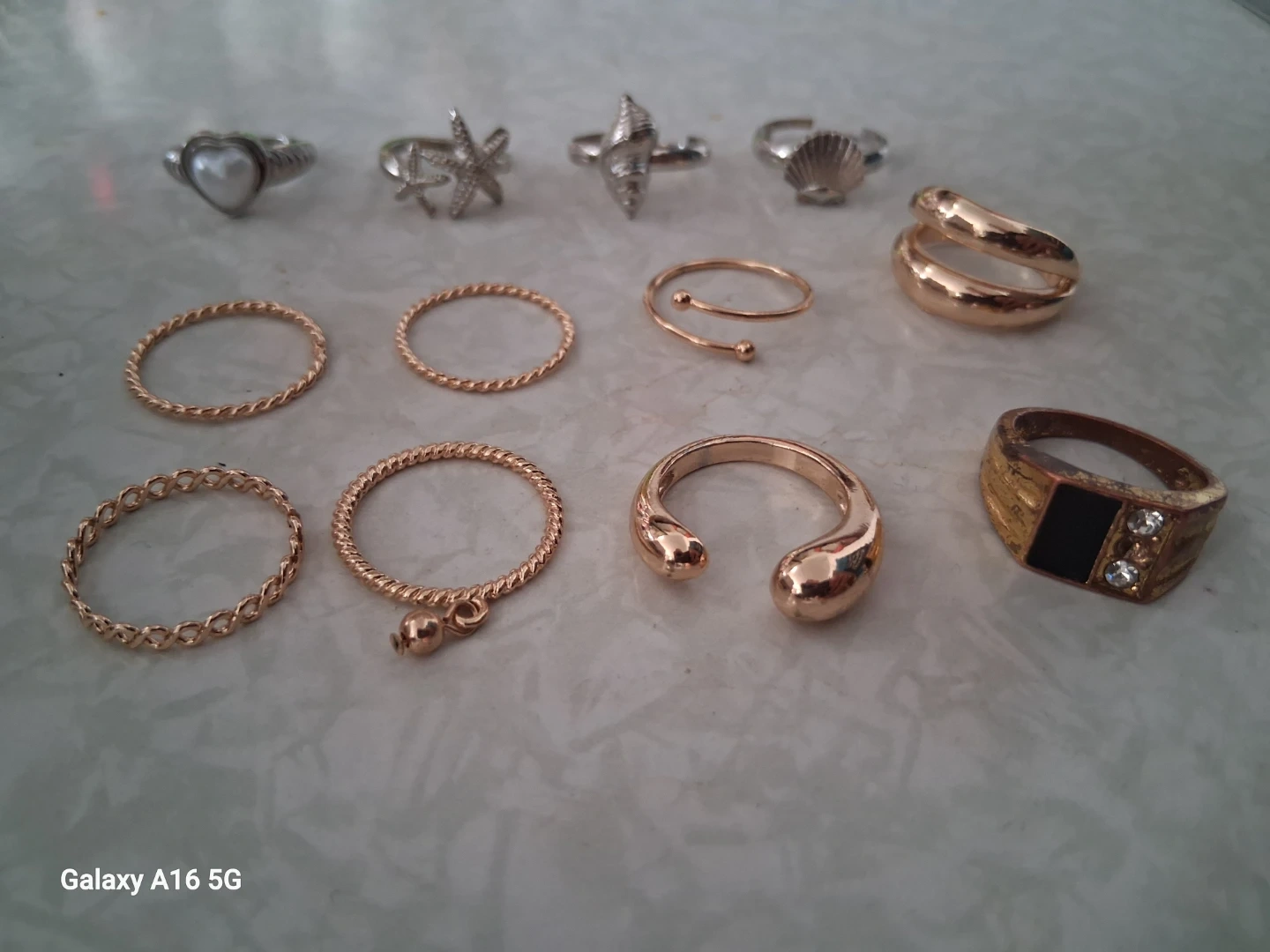 A collection of 9 assorted rings in various styles and colours, including pearl, starfish, shell, and geometric designs. Some are gold-toned, while others are silver-toned. They're great for stacking or wearing individually. Suitable for different occasions. Size 5-7. Mostly small medium size.
