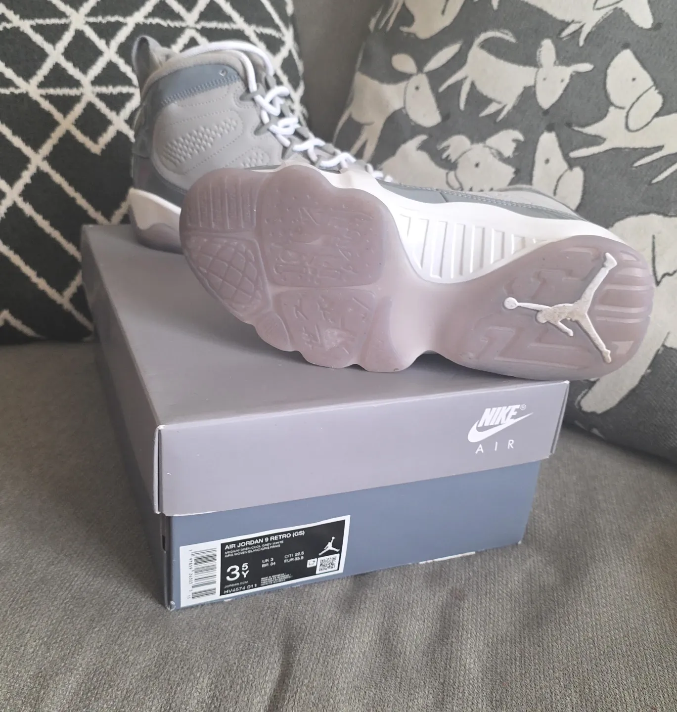 These are Nike Air Jordan 9 Retro (GS) sneakers in a size 3.5Y. They feature a grey and white colorway. Includes the original box. This is a youth size. (Used) wore once.