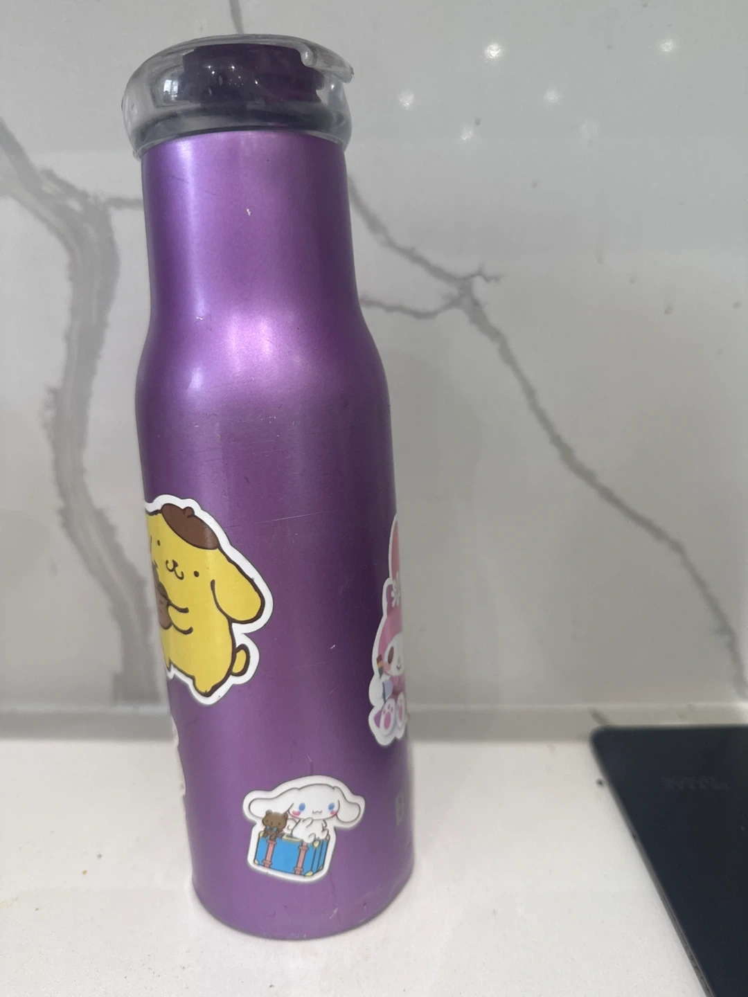 Here's a cute purple water bottle decorated with Sanrio character stickers! It's perfect for staying hydrated on the go. It's in great condition and ready for a new owner