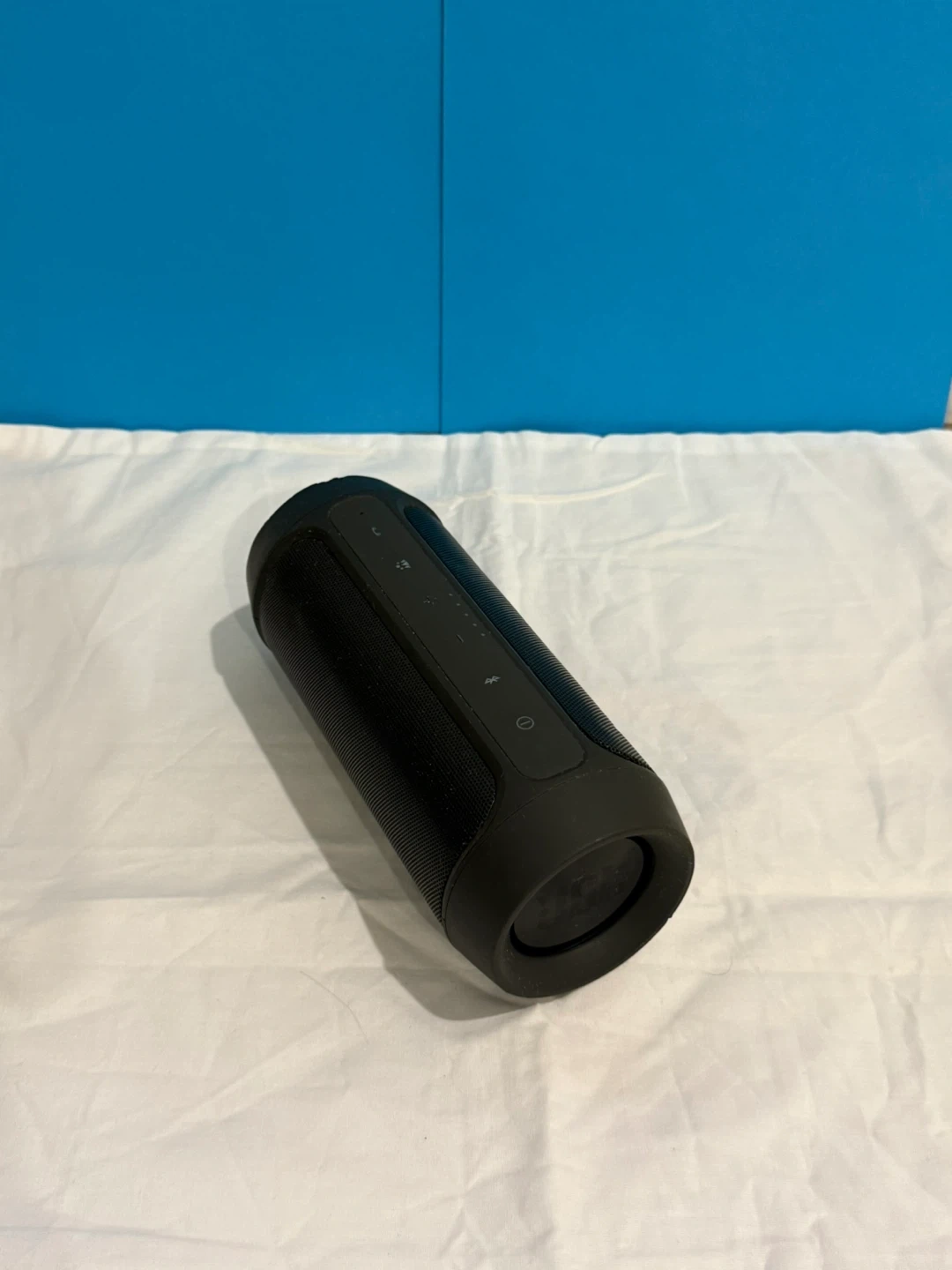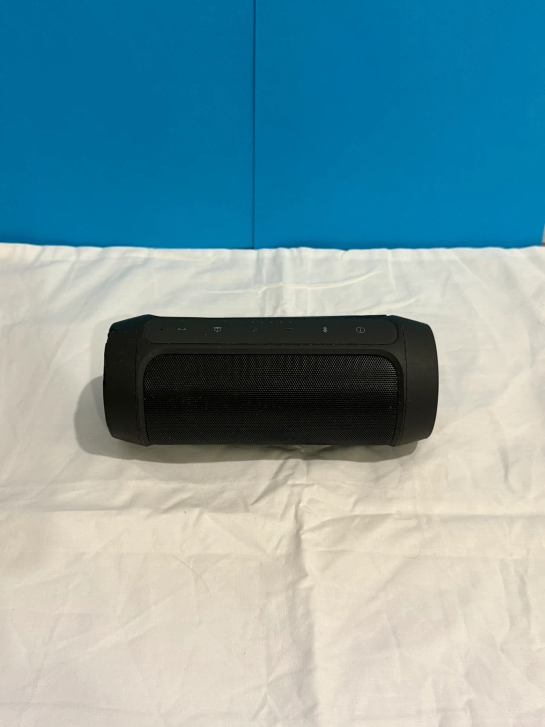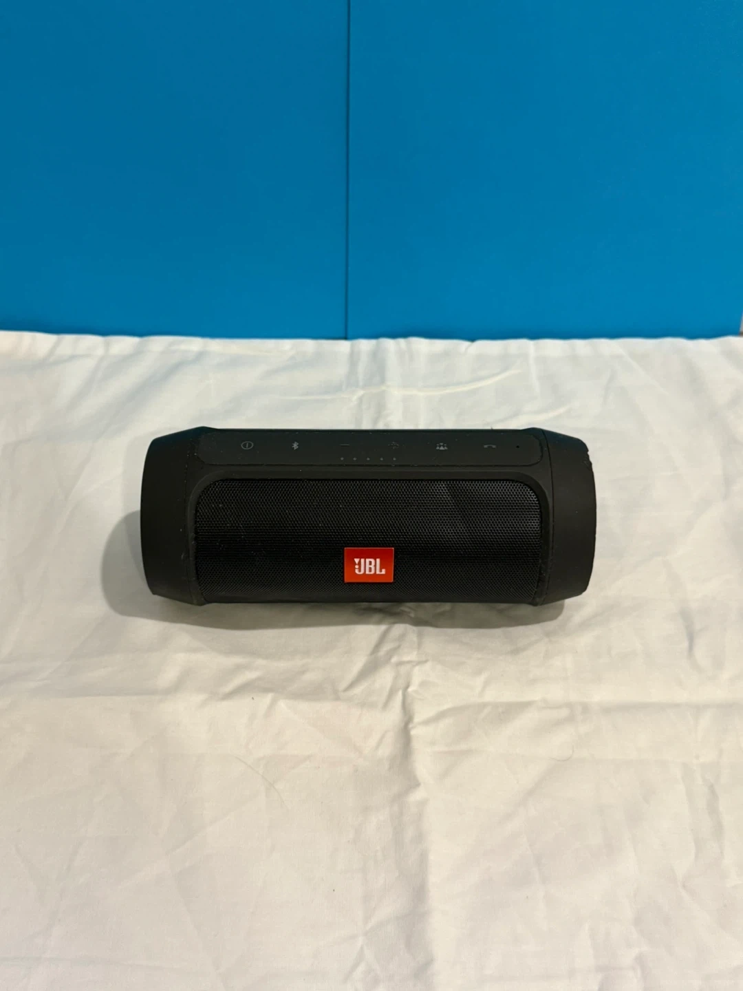 This is a black JBL Charge 2+ portable Bluetooth speaker. It's been used but still works great. Connect your devices wirelessly for music on the go! Perfect for backyard BBQs or a day at the park. Has a few small dents. Comes with a short charger
