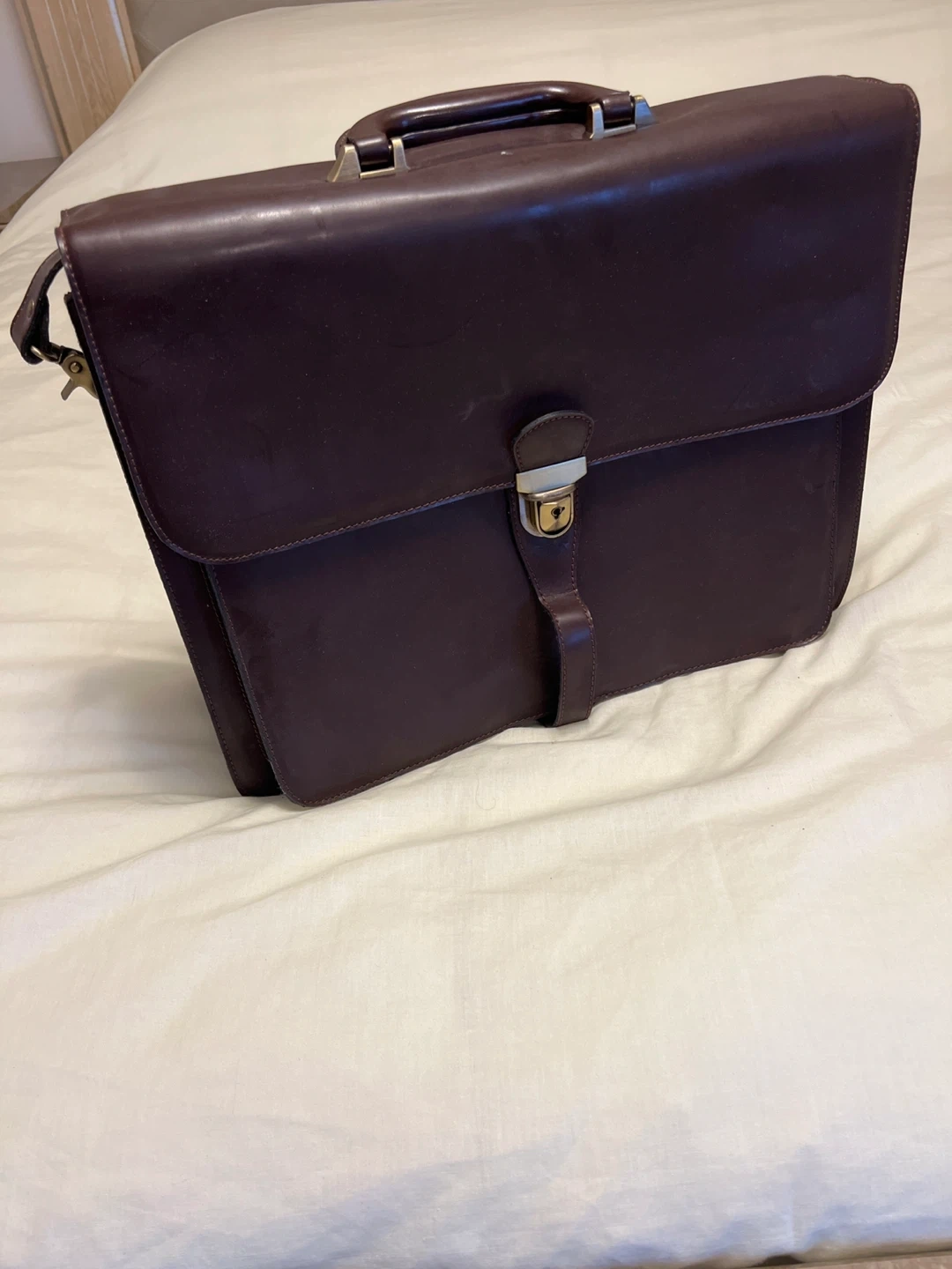 Classic dark brown leather briefcase with a sturdy handle and secure clasp closure. It features multiple compartments for organization and a detachable shoulder strap. A timeless accessory for carrying your essentials.