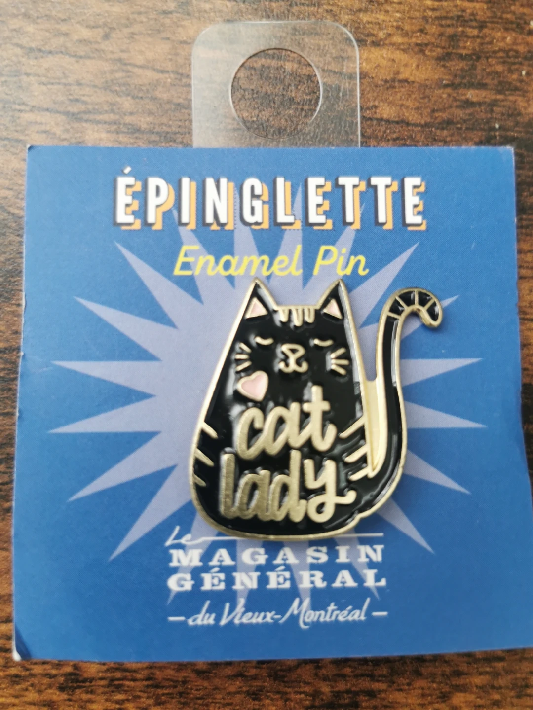 This is a black enamel pin shaped like a cat with 'cat lady' written on it. It comes on its original packaging from Le Magasin Général du Vieux-Montréal. It's a fun accessory for any cat lover!