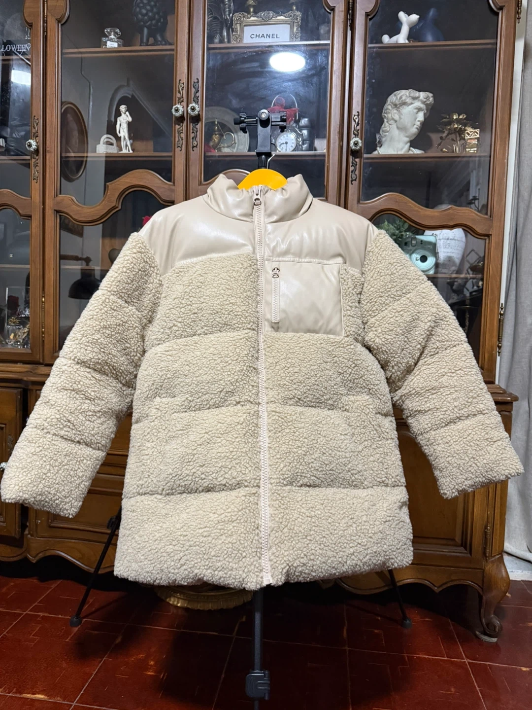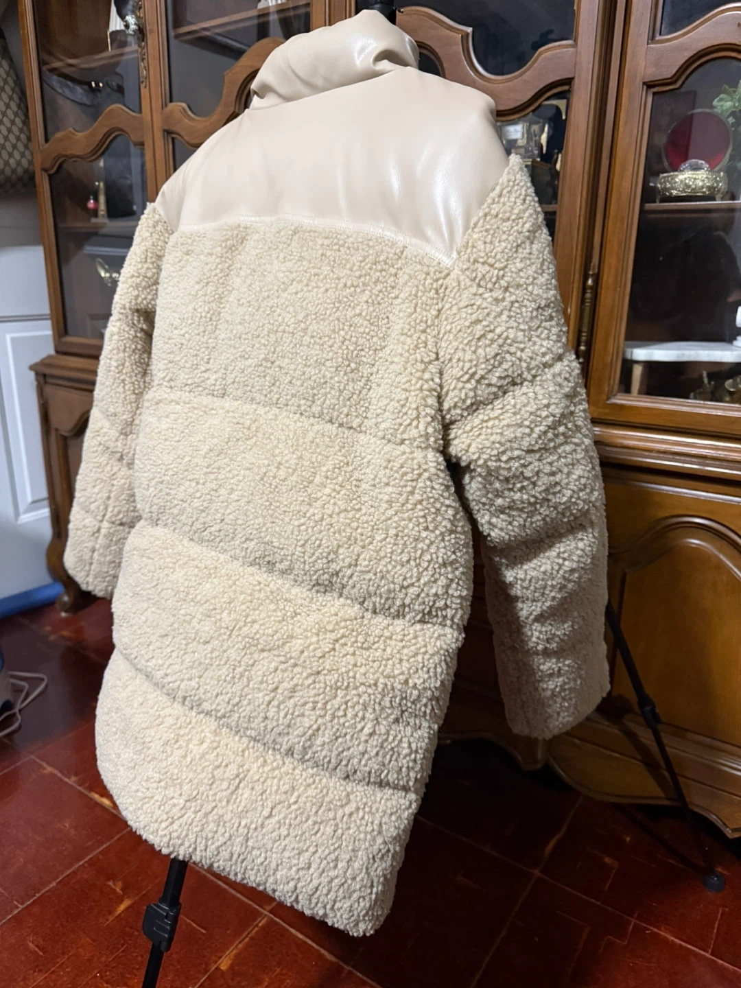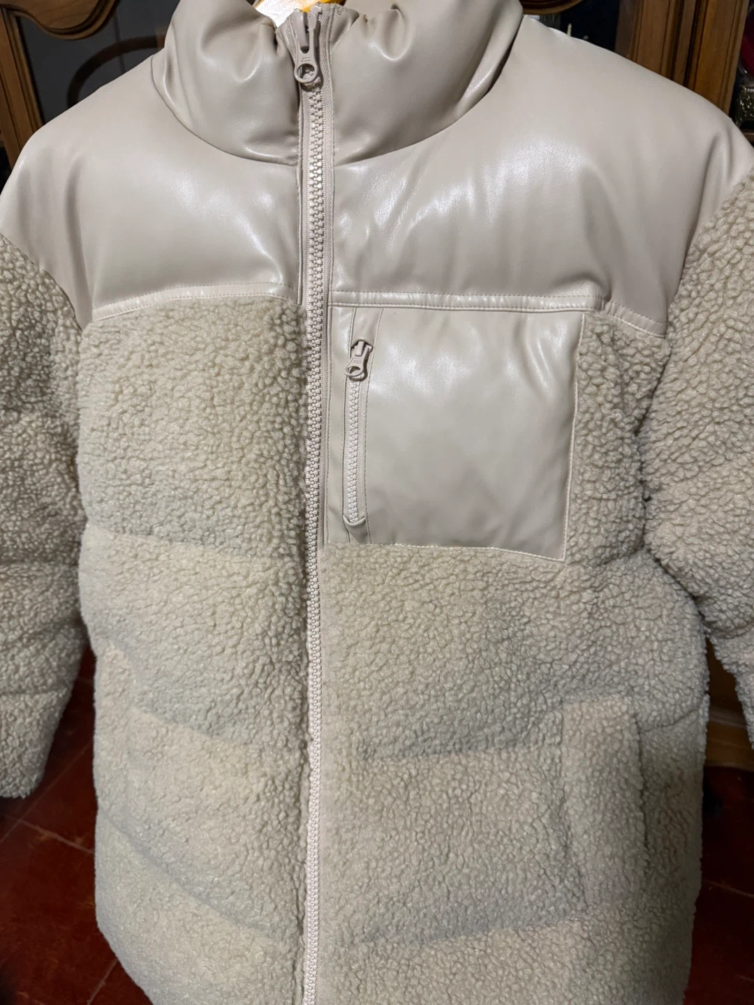 Cream sherpa jacket with faux leather paneling on the shoulders and chest. It features a zip-up front and a chest pocket with a zipper closure. Cozy and stylish for cooler weather!