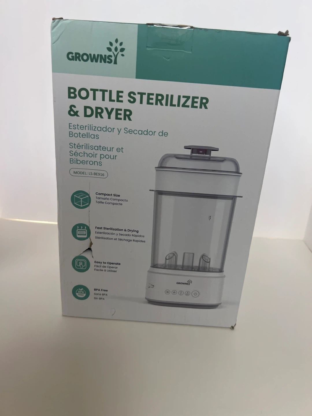 Selling a Grownsy Bottle Sterilizer & Dryer, model LS-BE916. It's designed for fast sterilization and drying, and it's easy to operate. It is also BPA free and has a compact size. Box included!