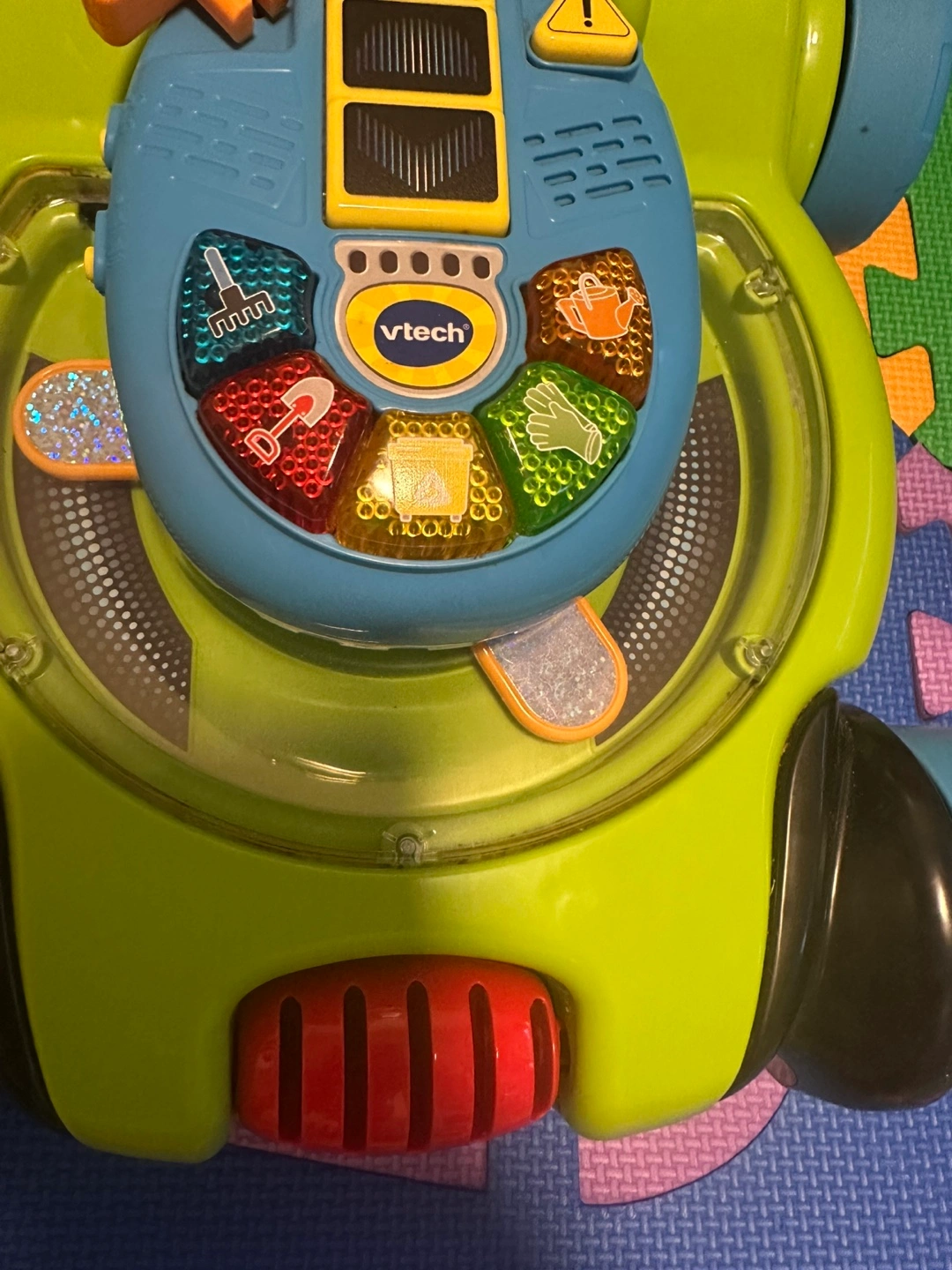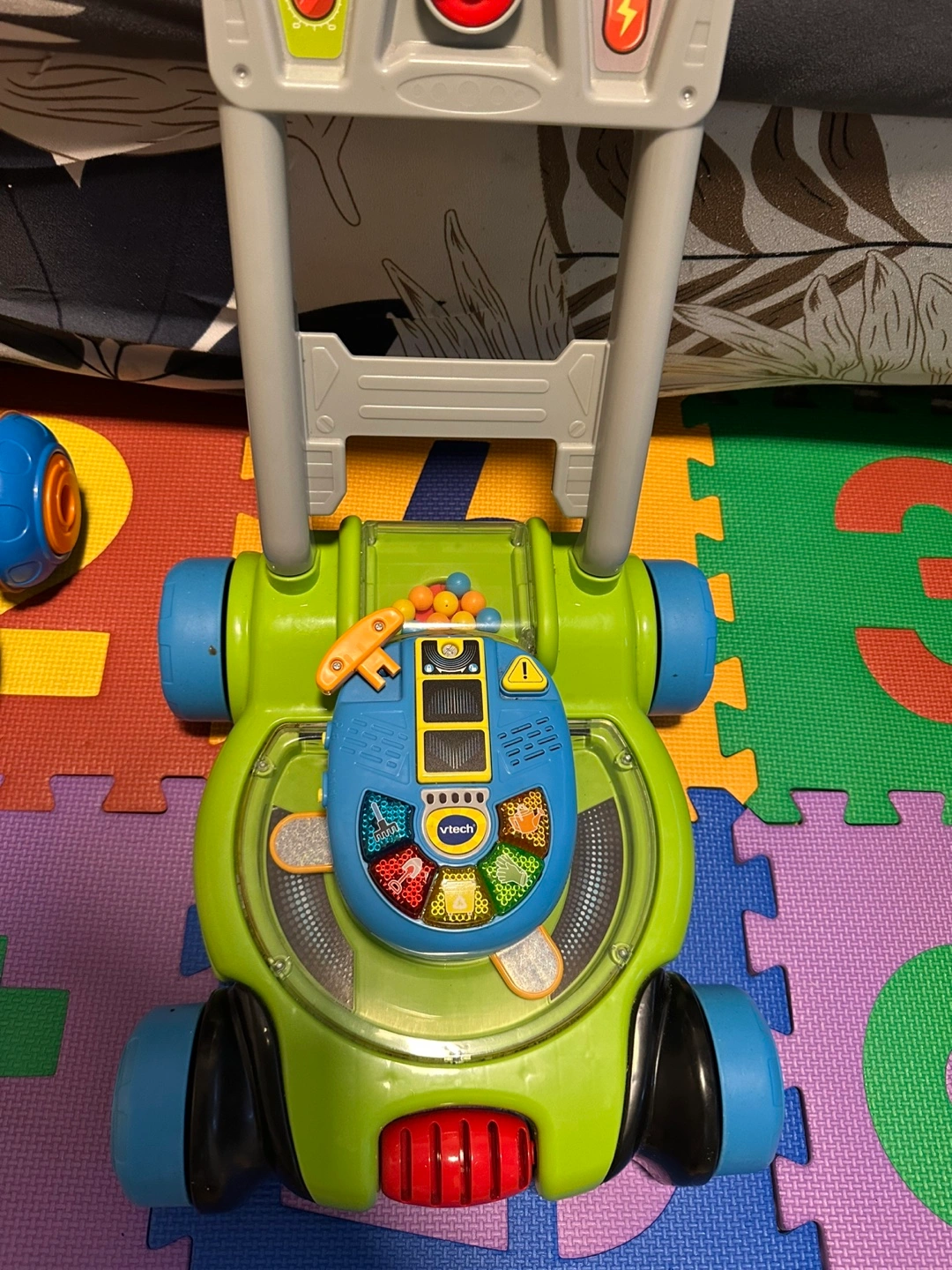 Interactive toy lawnmower. Features lights and sounds. Suitable for toddlers. Great for imaginative play. Includes handle for pushing.