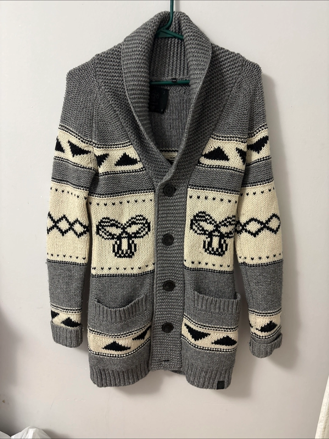 I am selling a comfortable, patterned cardigan. Grey colour with some details. A perfect piece to wear while enjoying a good book. Buttons down the front. Features a shawl collar and pockets.