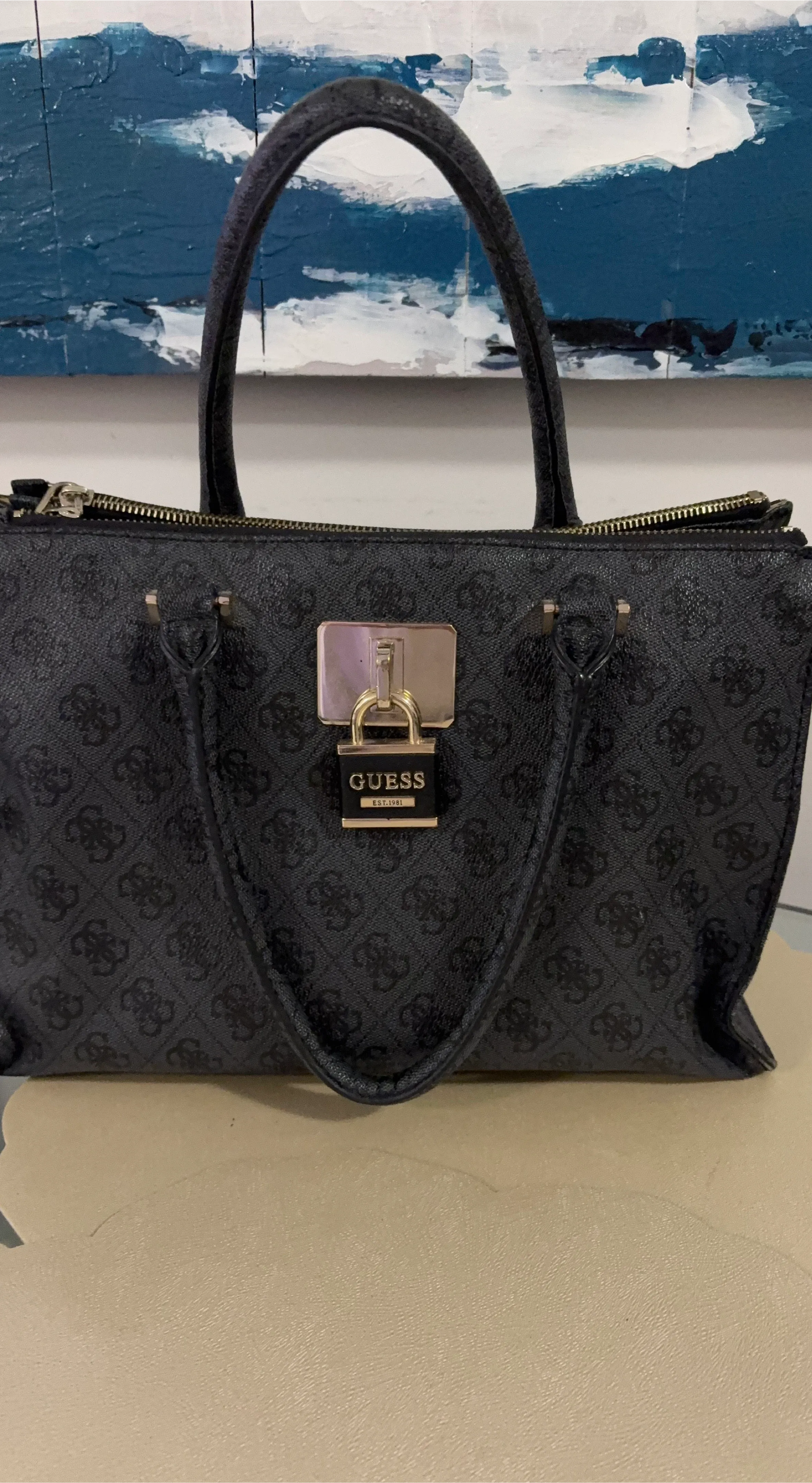 A stylish Guess handbag featuring a black patterned design. It's in great condition and ready for a new owner. Perfect for adding a touch of elegance to any outfit!