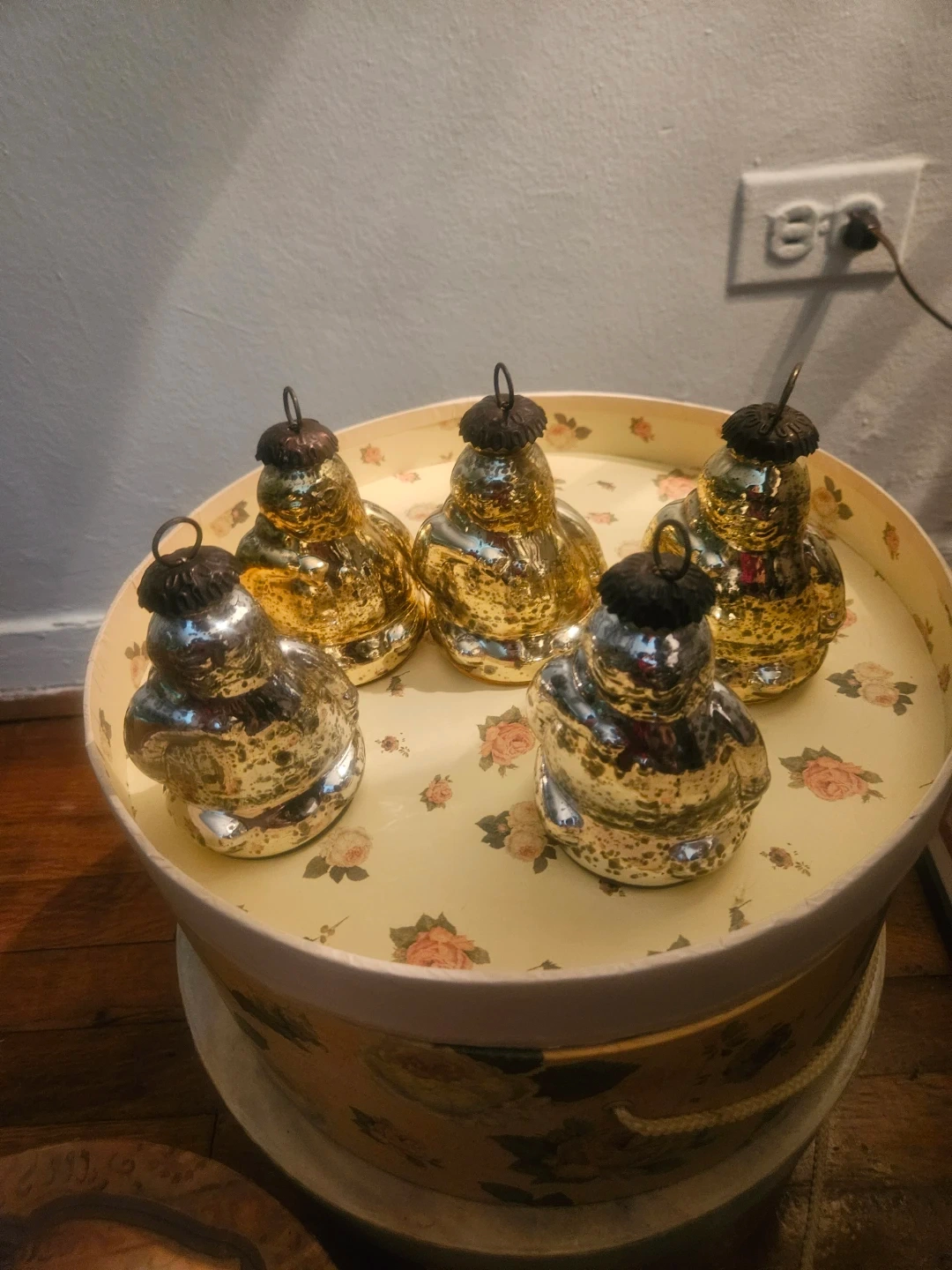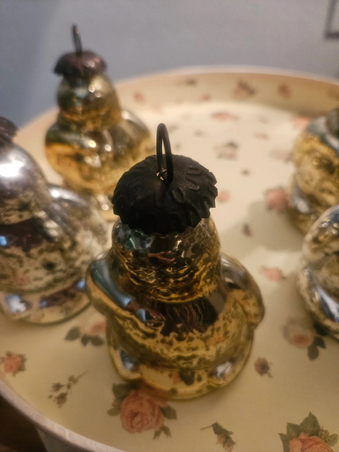 These are a set of five vintage of Kugels blown glass.Mercury Christmas ornaments. Each ornament has a hanging loop.r! Collectible.