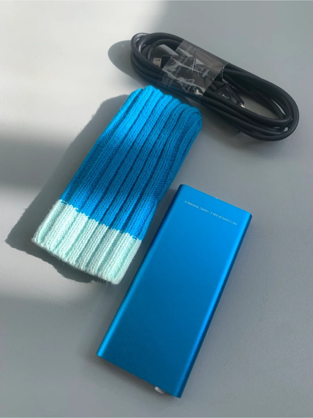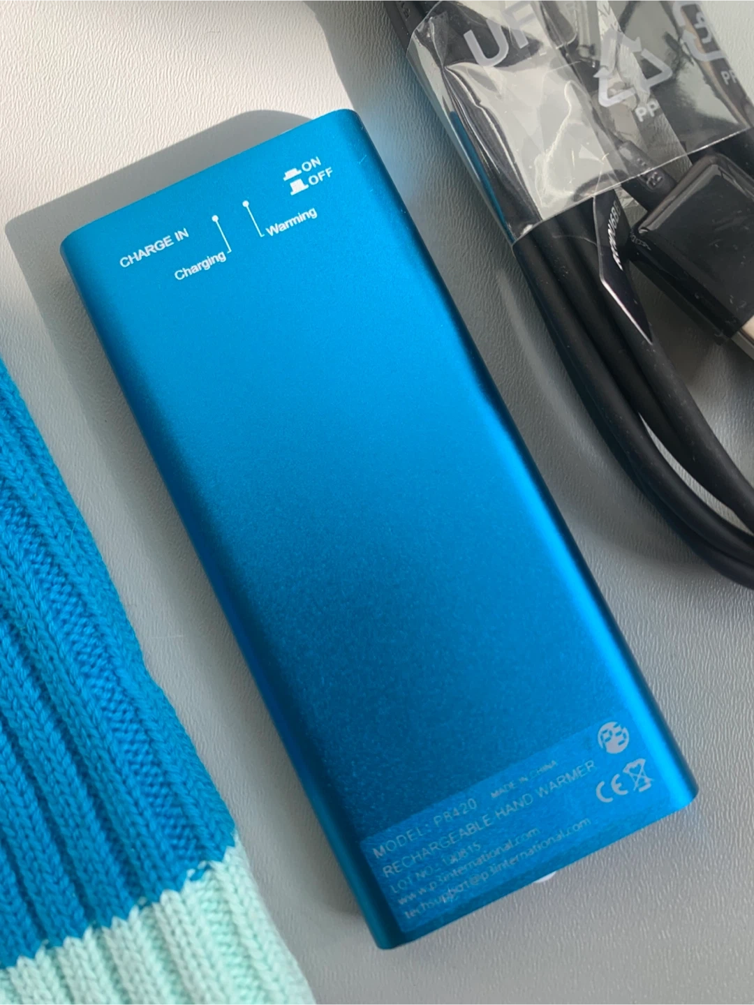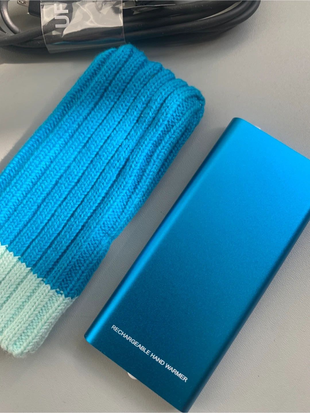 •Lee Valley blue rechargeable hand warmer, perfect for keeping your hands toasty on cold days. It comes with a USB charging cable and a knit sleeve. It's compact and fits easily in a pocket.
