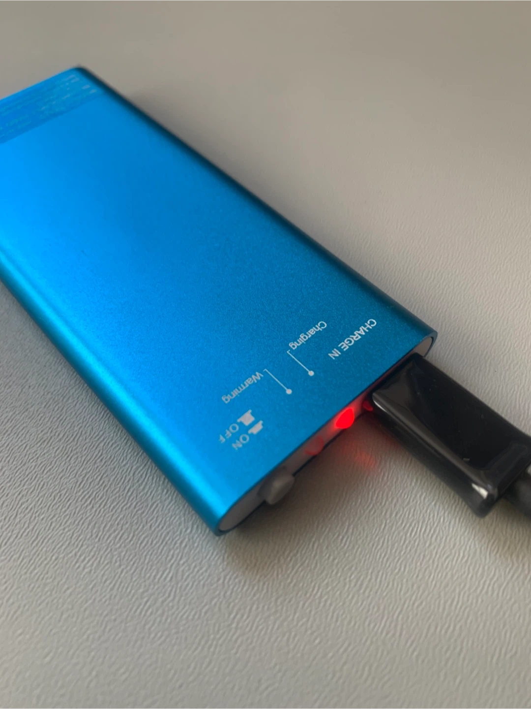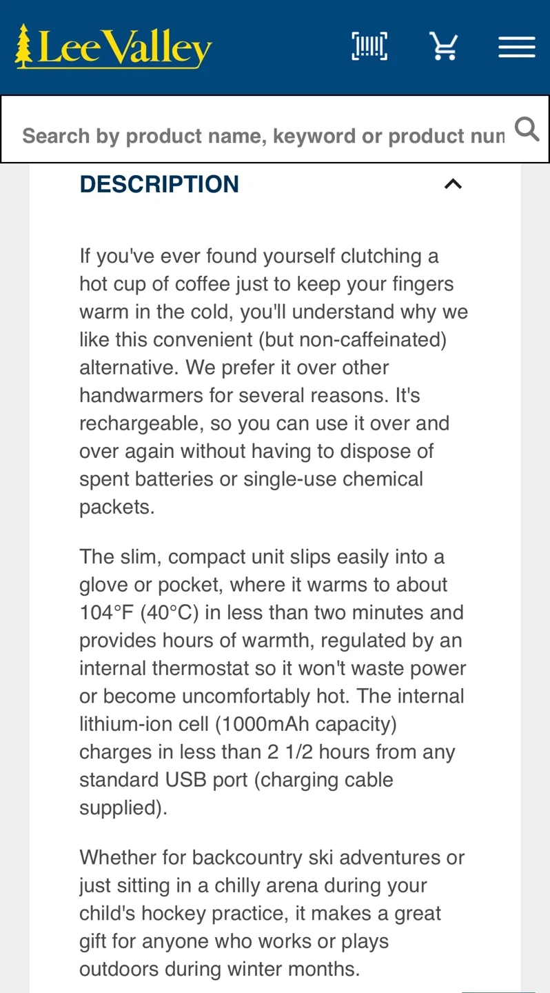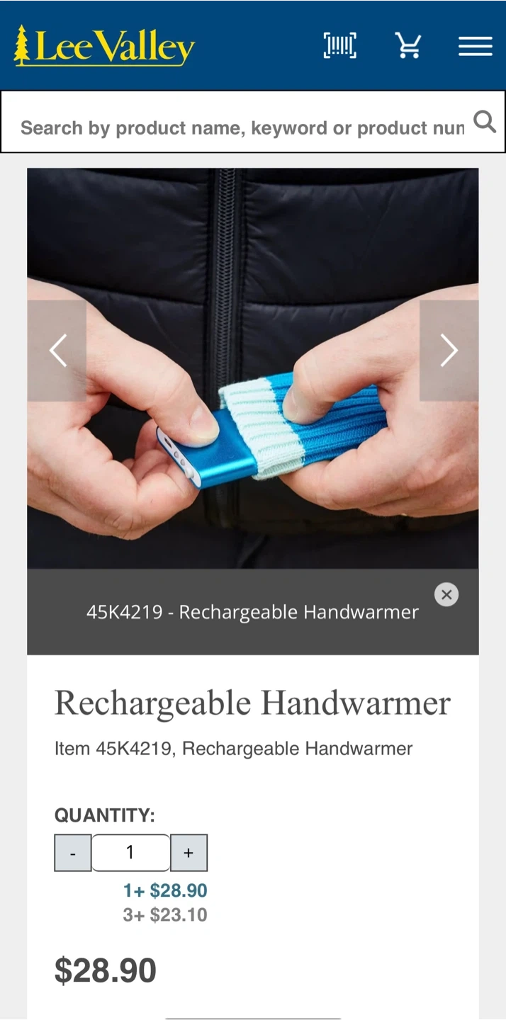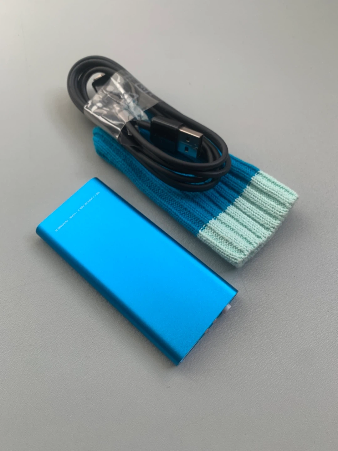 •Lee Valley blue rechargeable hand warmer, perfect for keeping your hands toasty on cold days. It comes with a USB charging cable and a knit sleeve. It's compact and fits easily in a pocket.