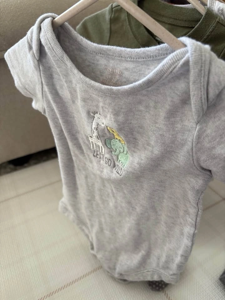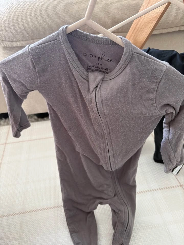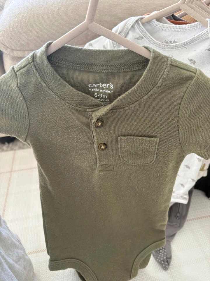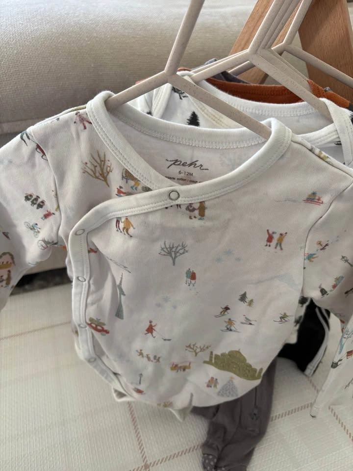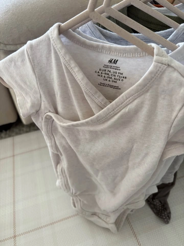 6-9M, couple of 9-12M baby bundle of 10 items - (t-shirt onesies, long-sleeve onesies, sleeper and pants). Mix of brands including Pehr, H&M, Pip & Phee, George, Carter’s, OshKosh and Pekkle).