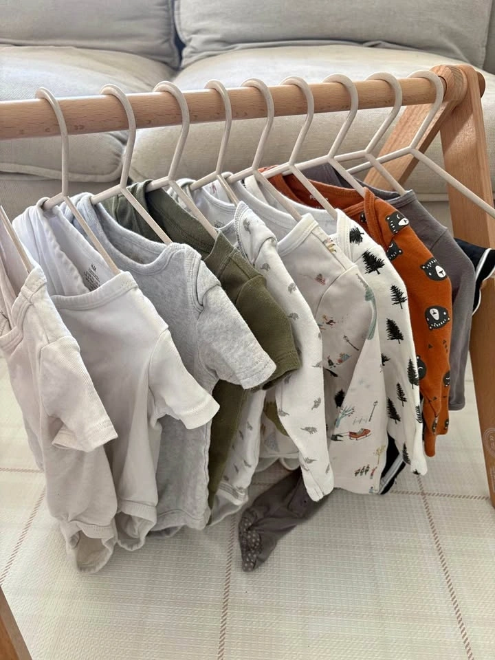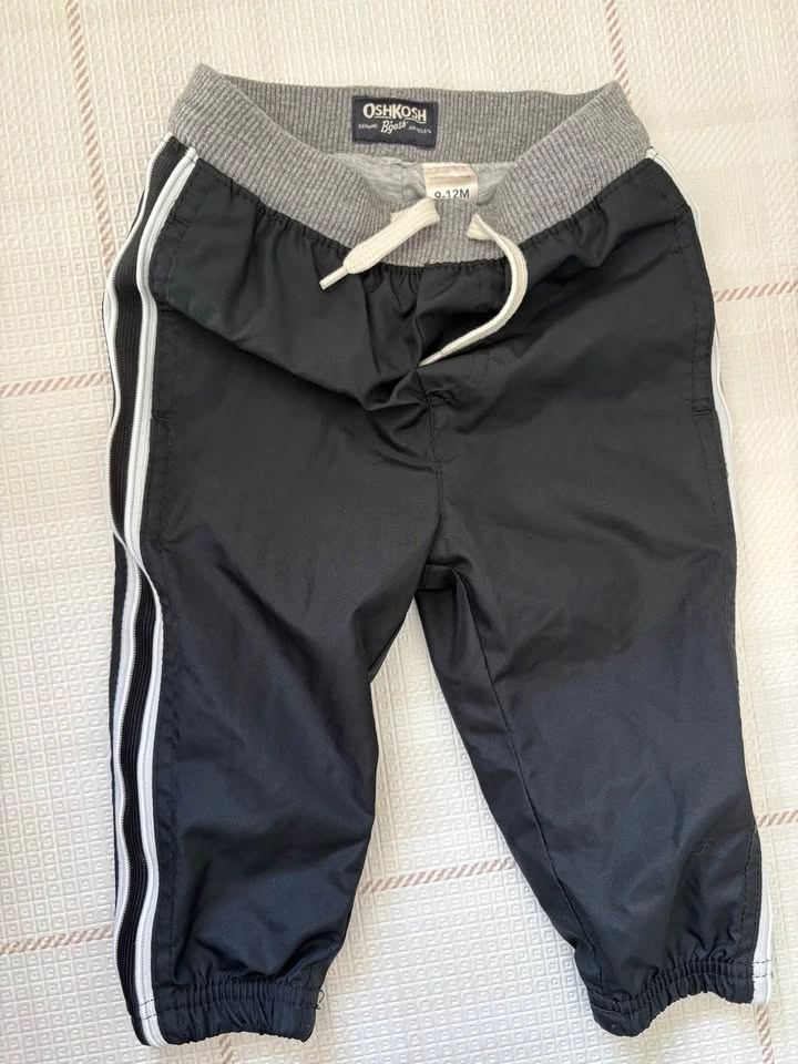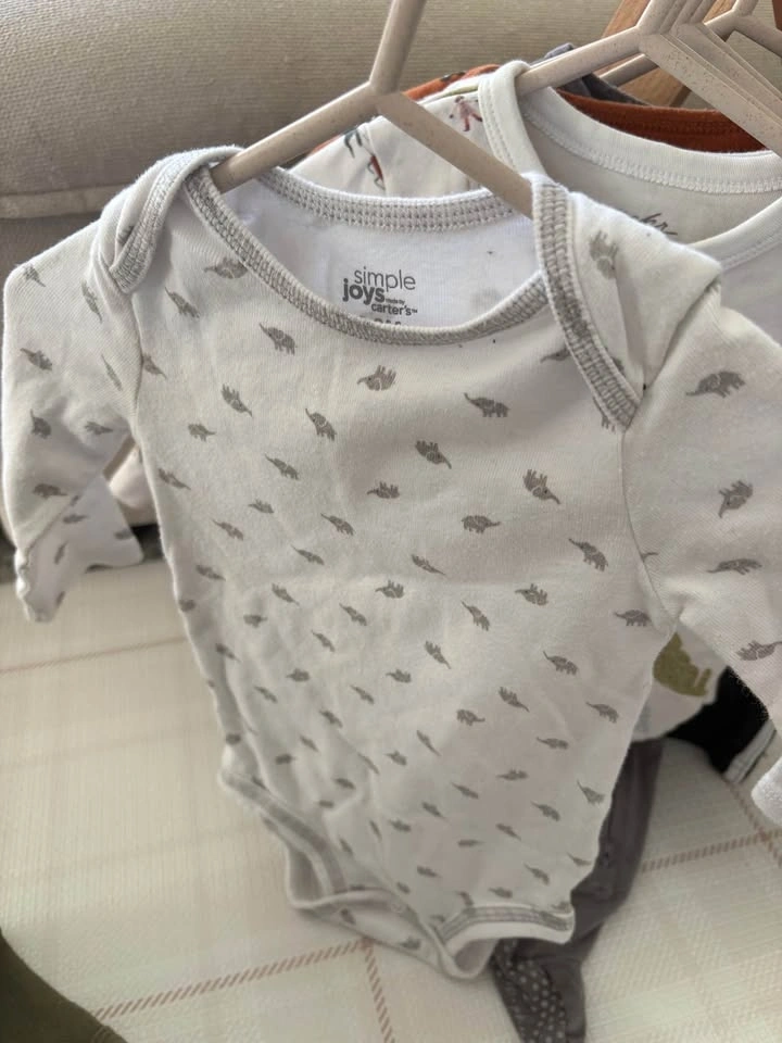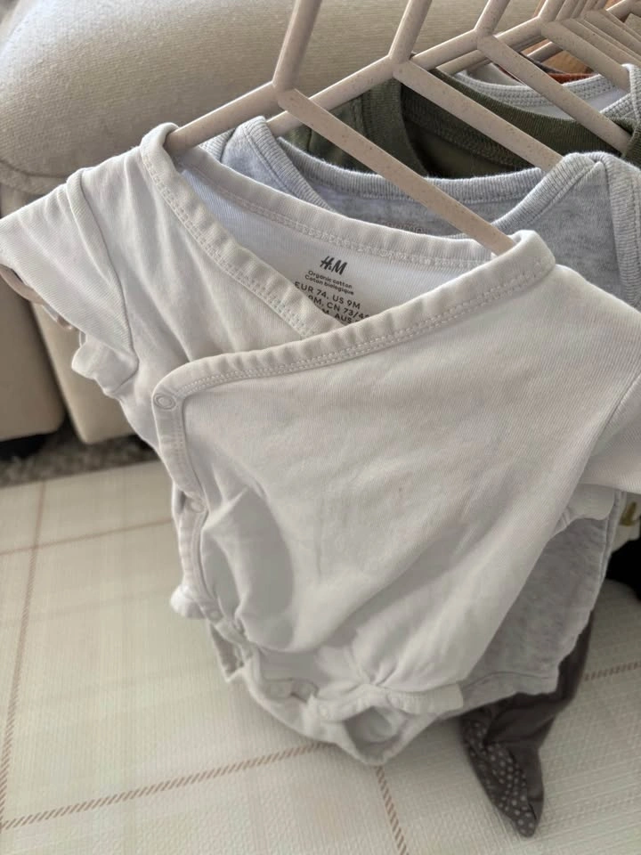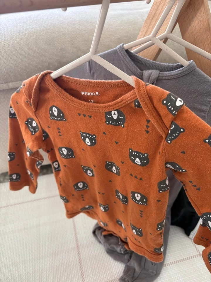 6-9M, couple of 9-12M baby bundle of 10 items - (t-shirt onesies, long-sleeve onesies, sleeper and pants). Mix of brands including Pehr, H&M, Pip & Phee, George, Carter’s, OshKosh and Pekkle).