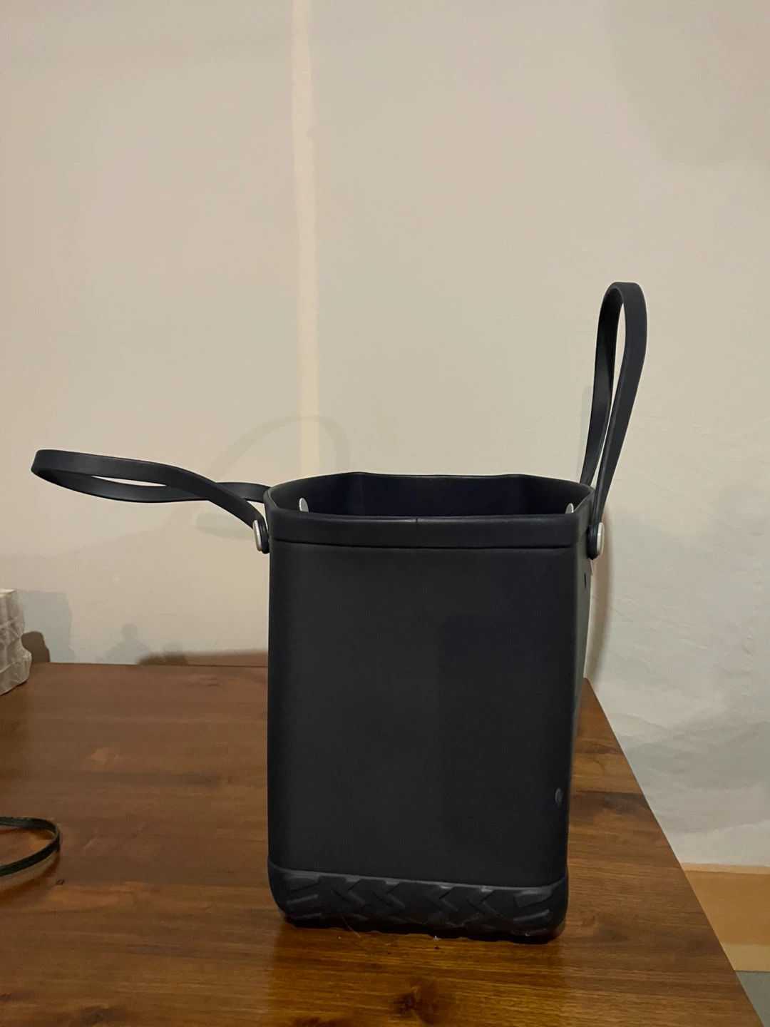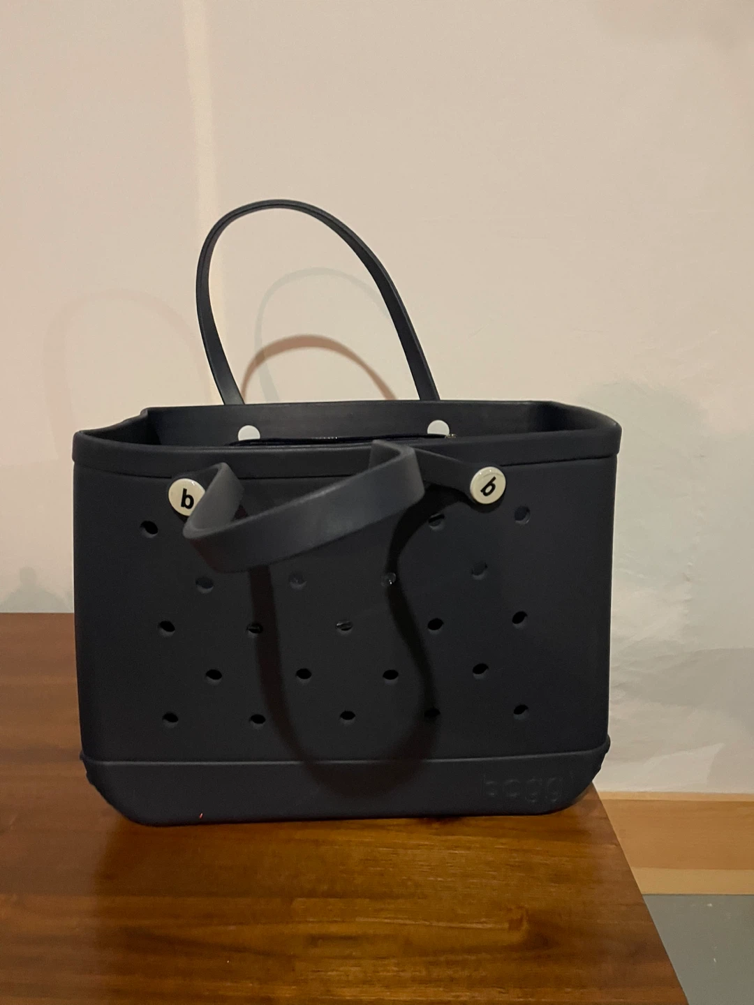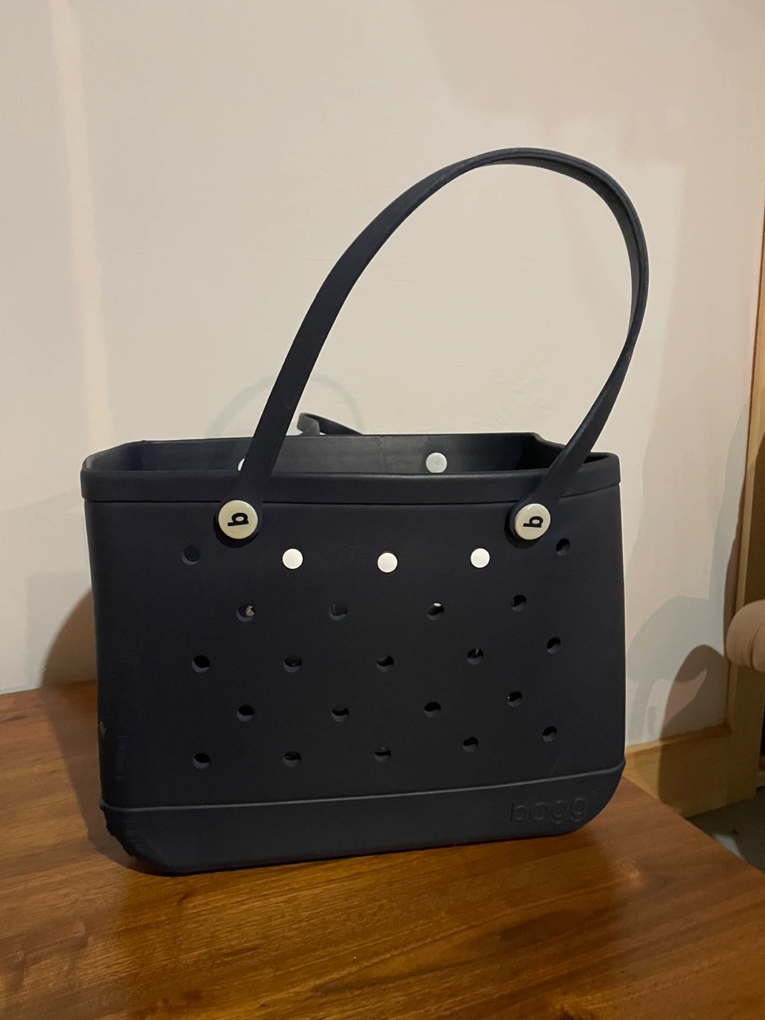 Here's a Bogg Bag tote in navy blue! It's a great tote for everyday use or a day at the beach. It's durable and easy to clean, too.