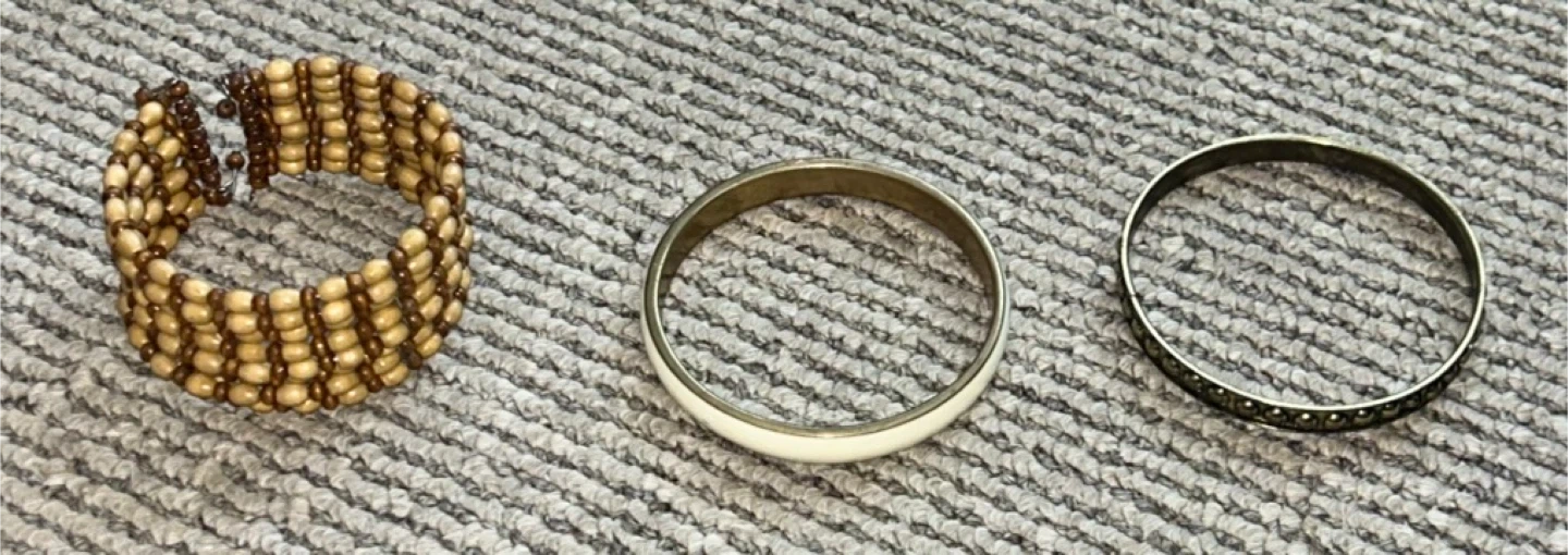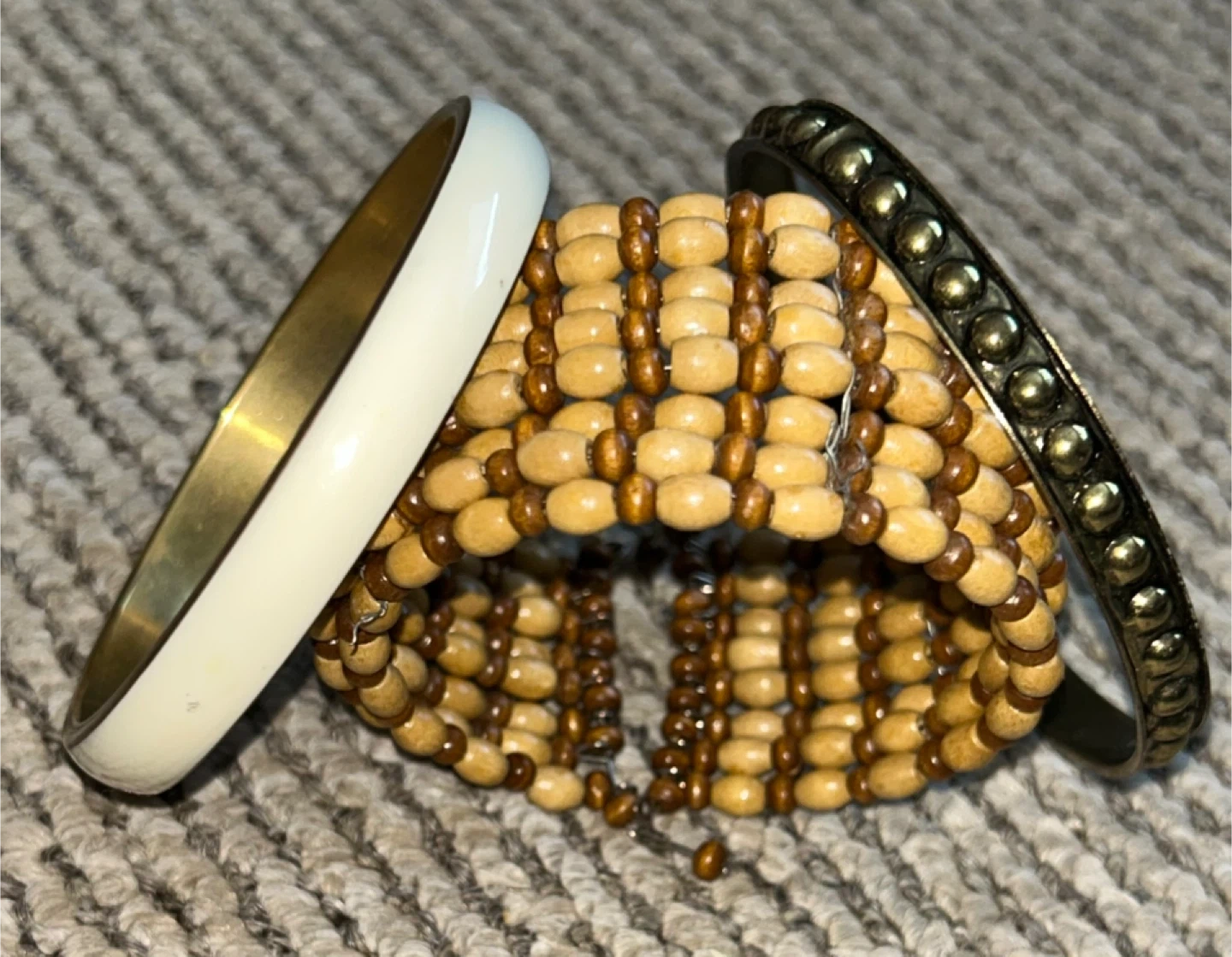 Three bangles for your wrist. Includes a wood bead bracelet, a cream-coloured smooth bangle, and a dark metal bangle with gold-tone details. Mix and match these accessories!