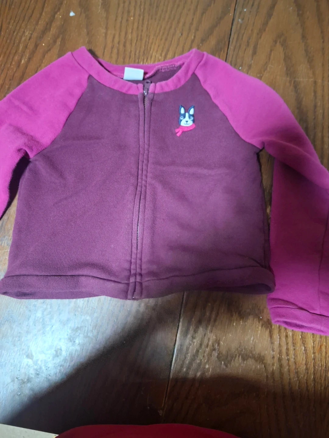 This cute zip-up sweater features a contrasting pink and burgundy colour scheme. It has a small embroidered dog graphic on the chest. Made from a soft, comfortable material for little ones. Size 6
