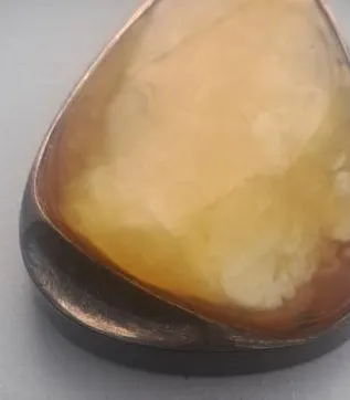 Selling a unique amber pendant. It has a beautiful teardrop shape and lovely warm tones. The amber is set in a metal frame, making it a stylish accessory for any outfit