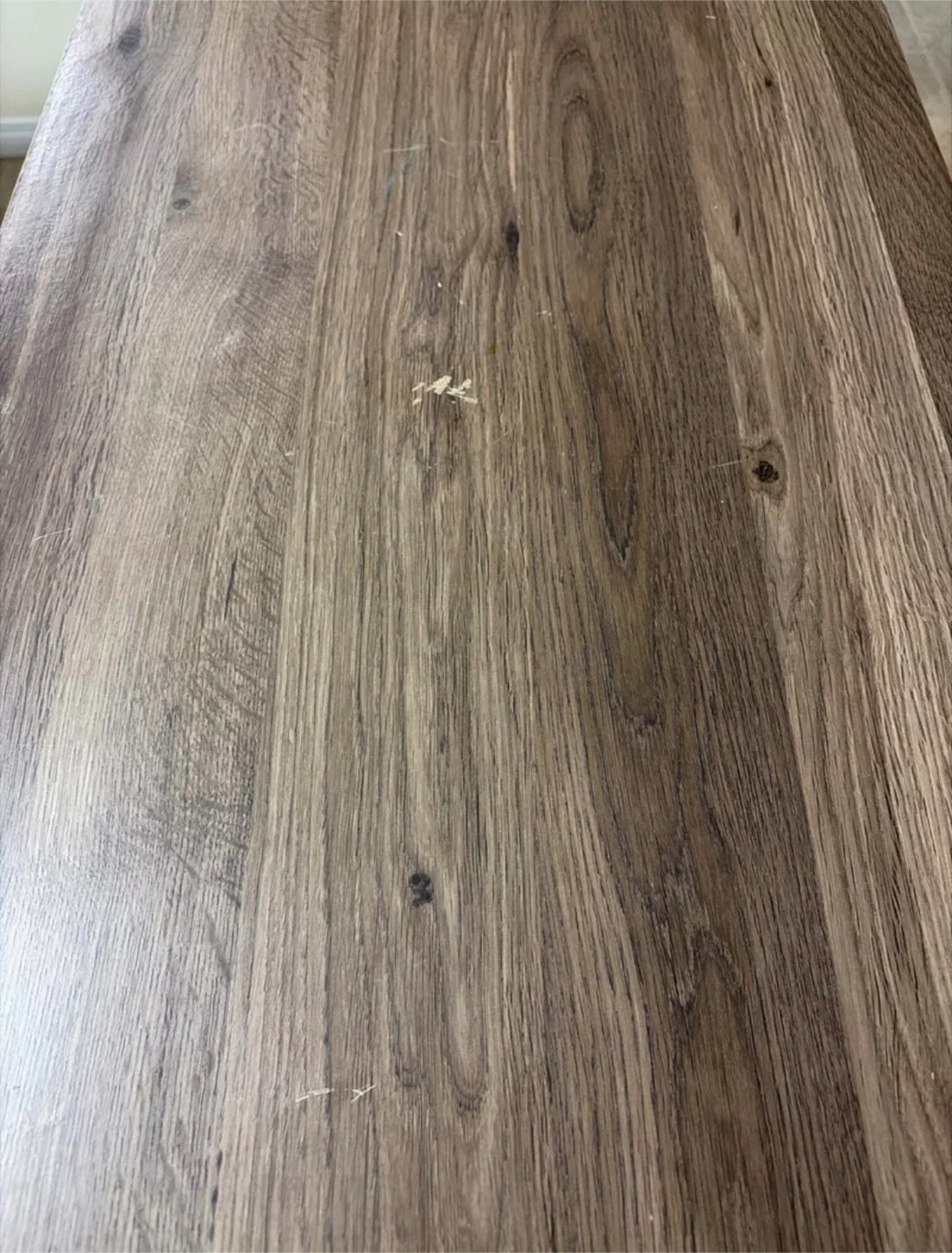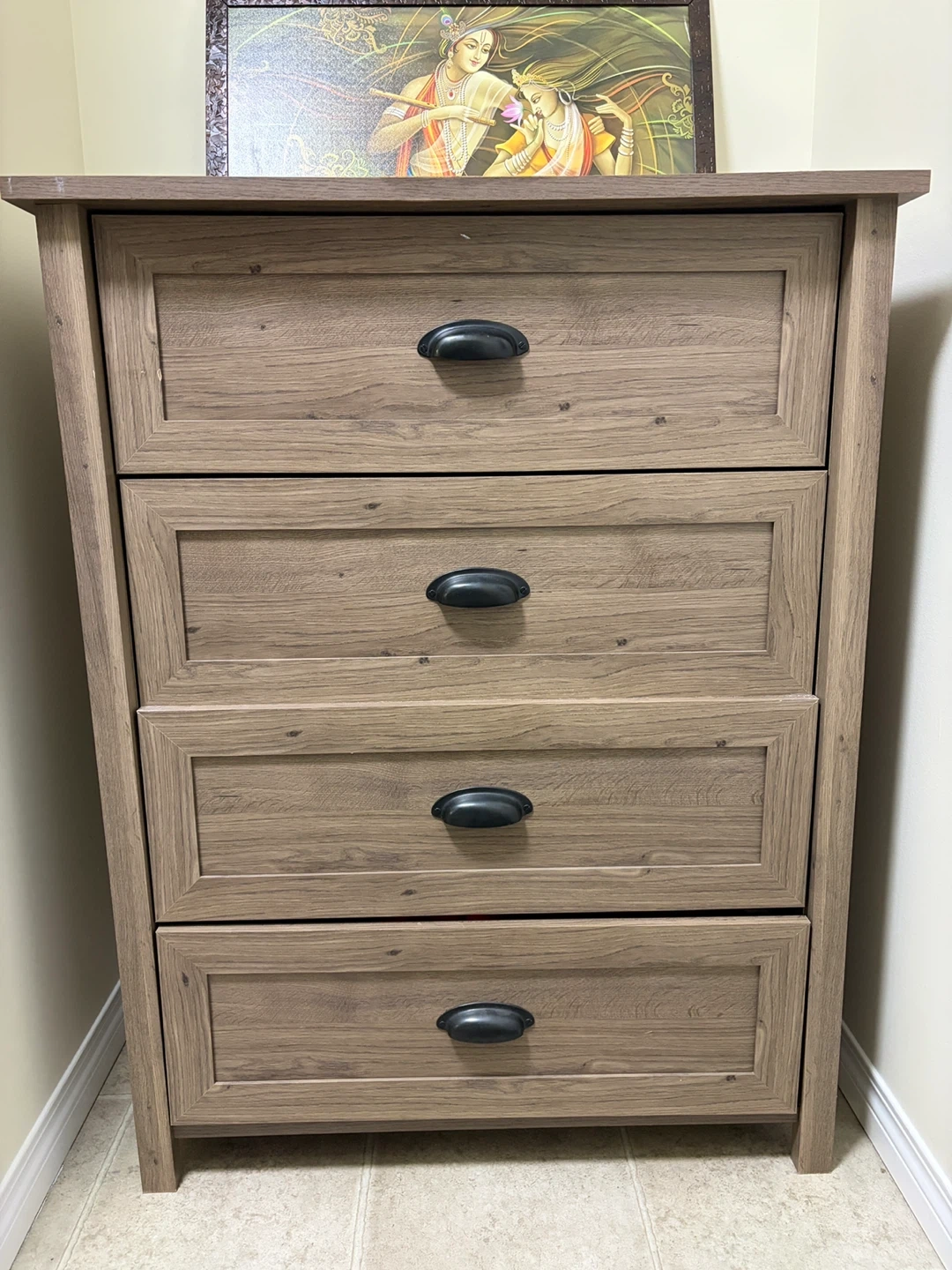 This is a four-drawer dresser with a wood finish and black handles. It offers ample storage space for clothes or linens. It's a great addition to any bedroom! We are selling because we are moving, the top has some scratches and two drawers have a small gap in between.