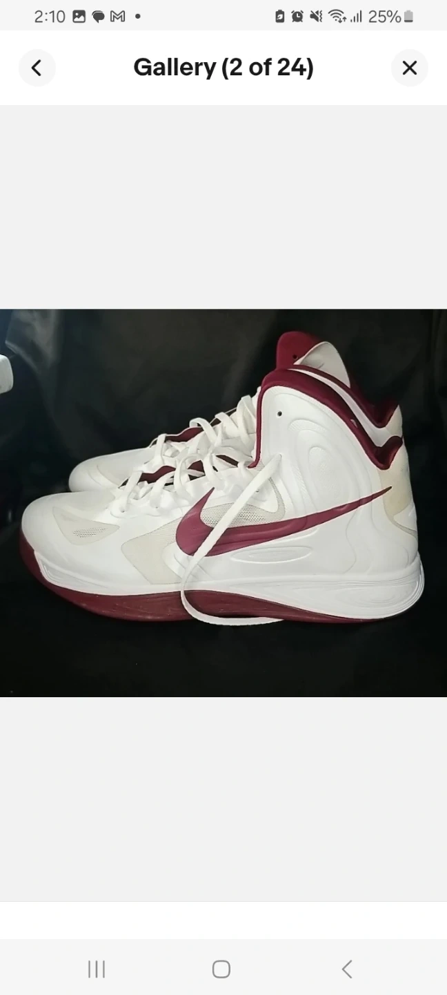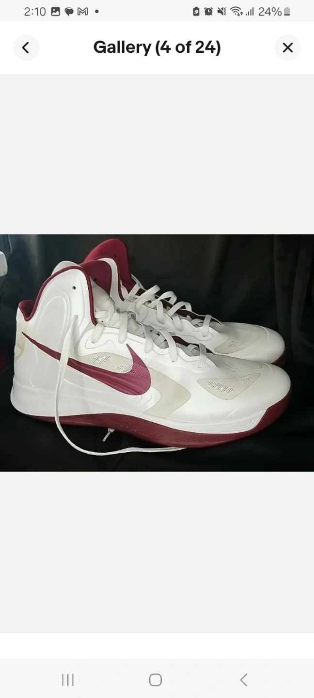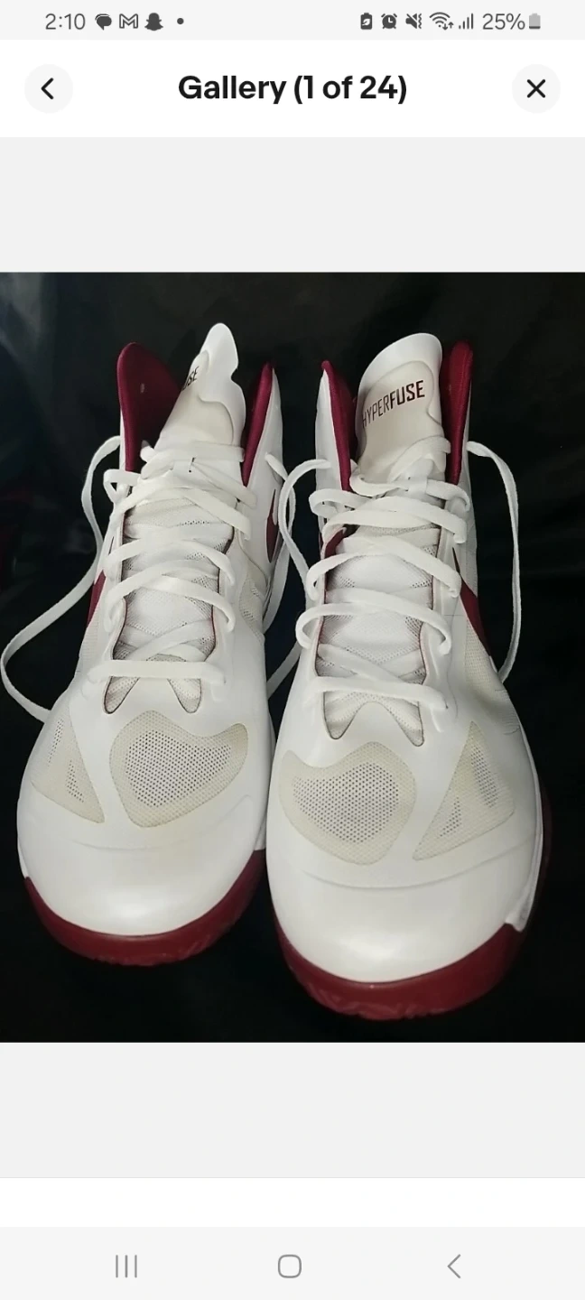 Nike Hyperfuse basketball shoes in white with maroon accents. Low-top design with lace-up closure. Rubber sole provides good traction.