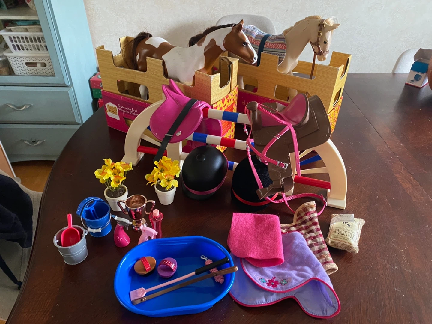 This set includes two toy horses, a stable, a saddle, a helmet, and various grooming accessories. It's perfect for imaginative play with horses. Comes with buckets, brushes, and a trough. NOTE: pick up will be in Oshawa