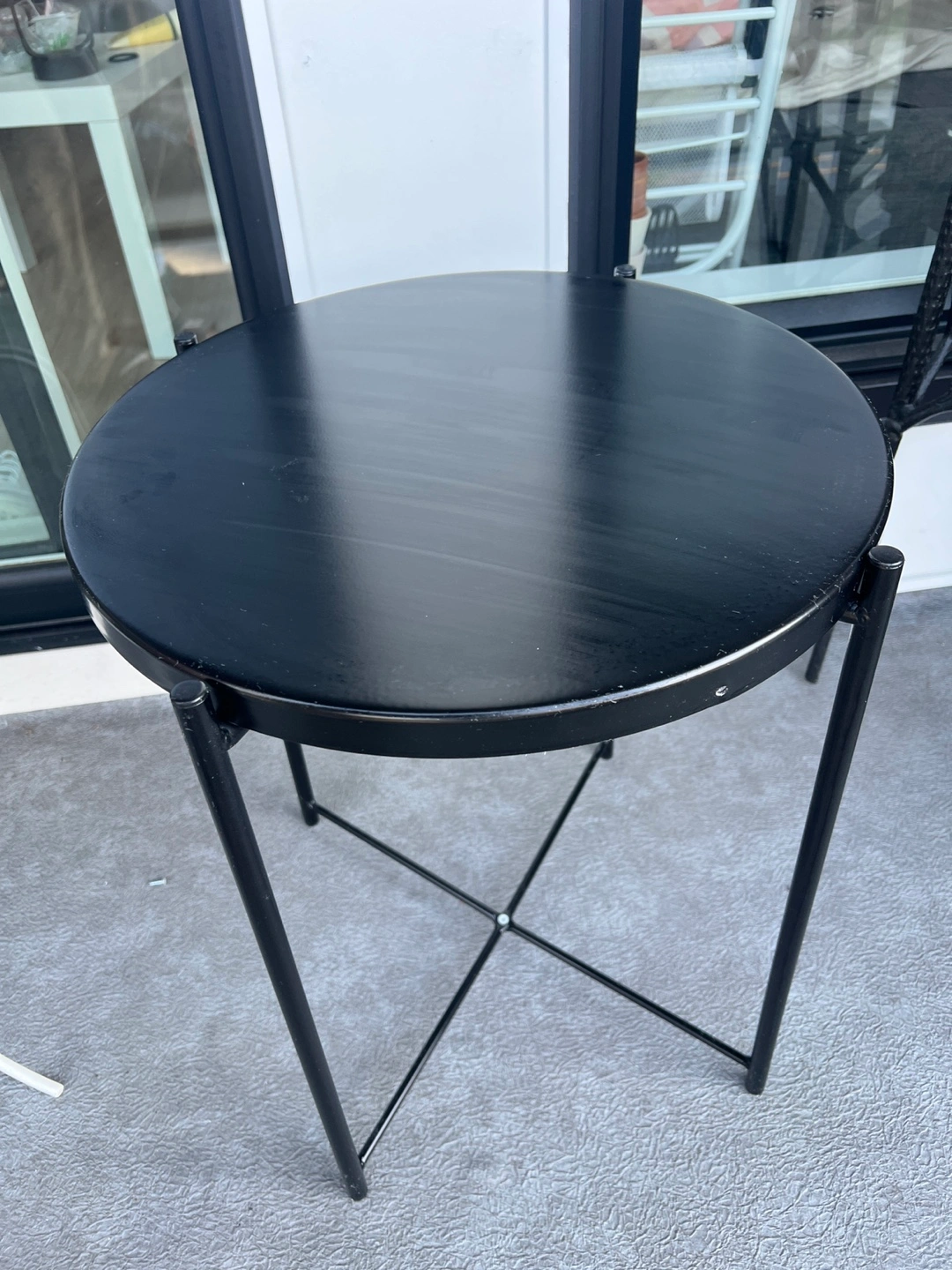 A simple black round side table with a metal frame. Its top is black and can turn over. The base has an X-shaped support. This table's compact size makes it a handy surface for drinks or small decor items.