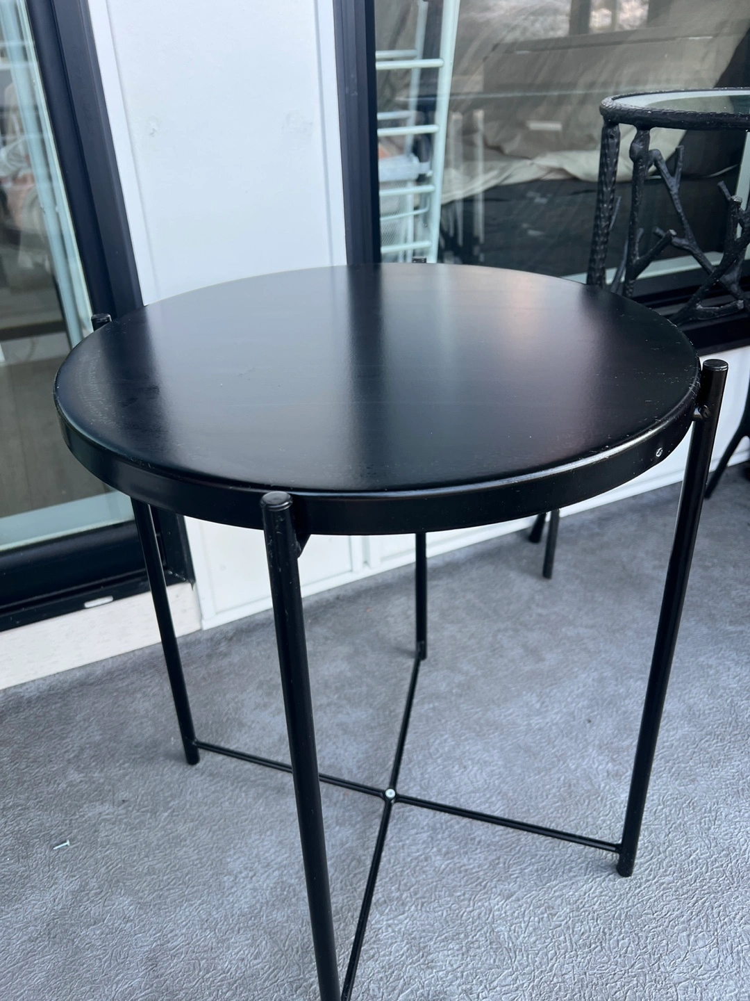 A simple black round side table with a metal frame. Its top is black and can turn over. The base has an X-shaped support. This table's compact size makes it a handy surface for drinks or small decor items.