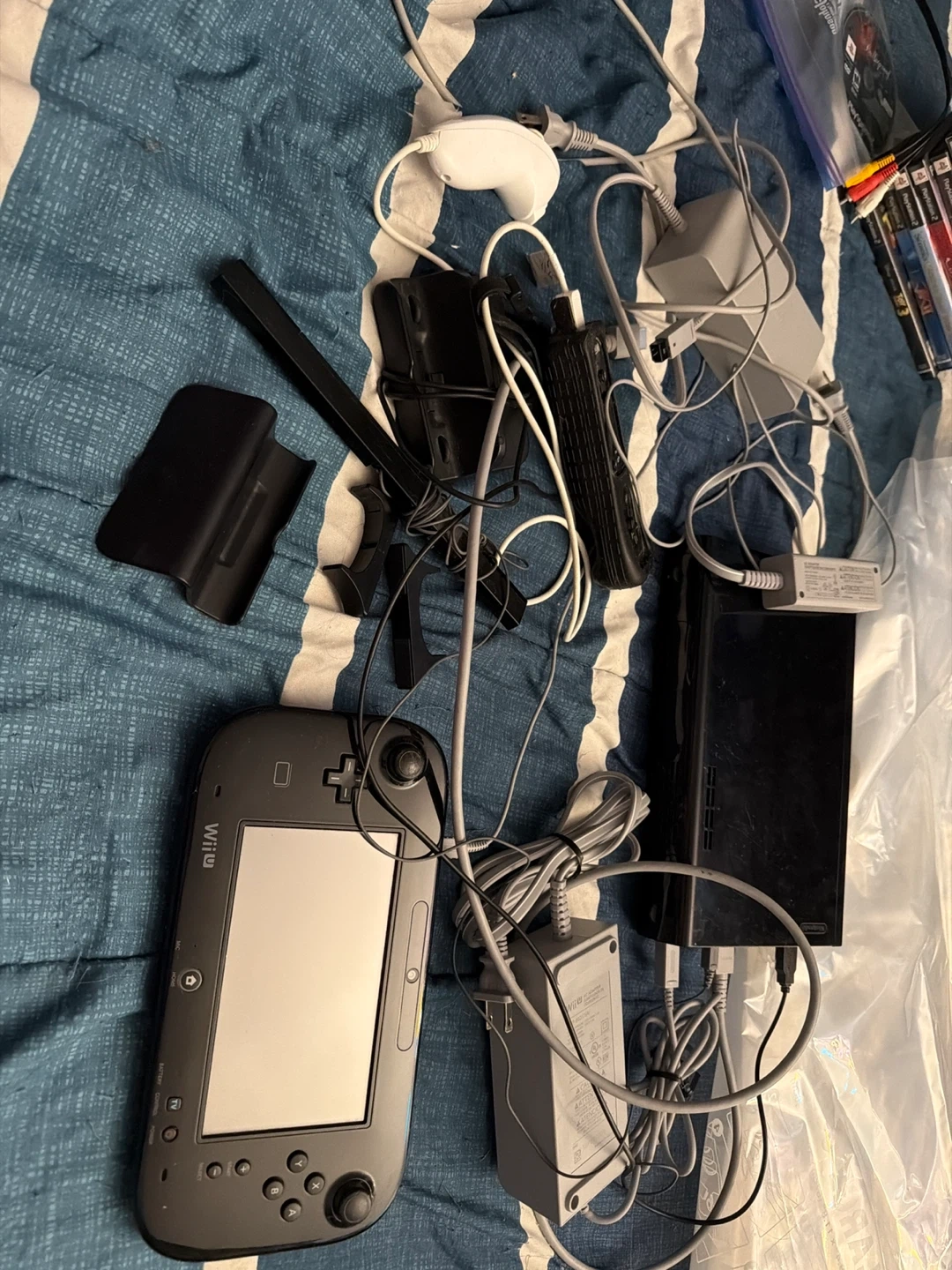 This is a Nintendo Wii U console with its GamePad and various accessories. Includes controllers, cables, and power adapters. Bundle it with games for endless fun! Has one controller, one nunchuck, and a extra power source