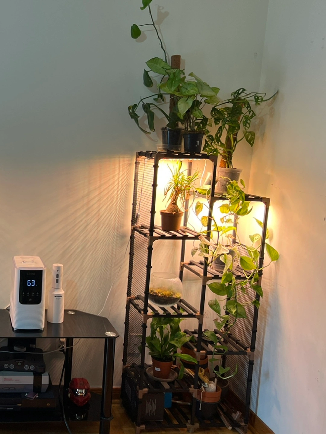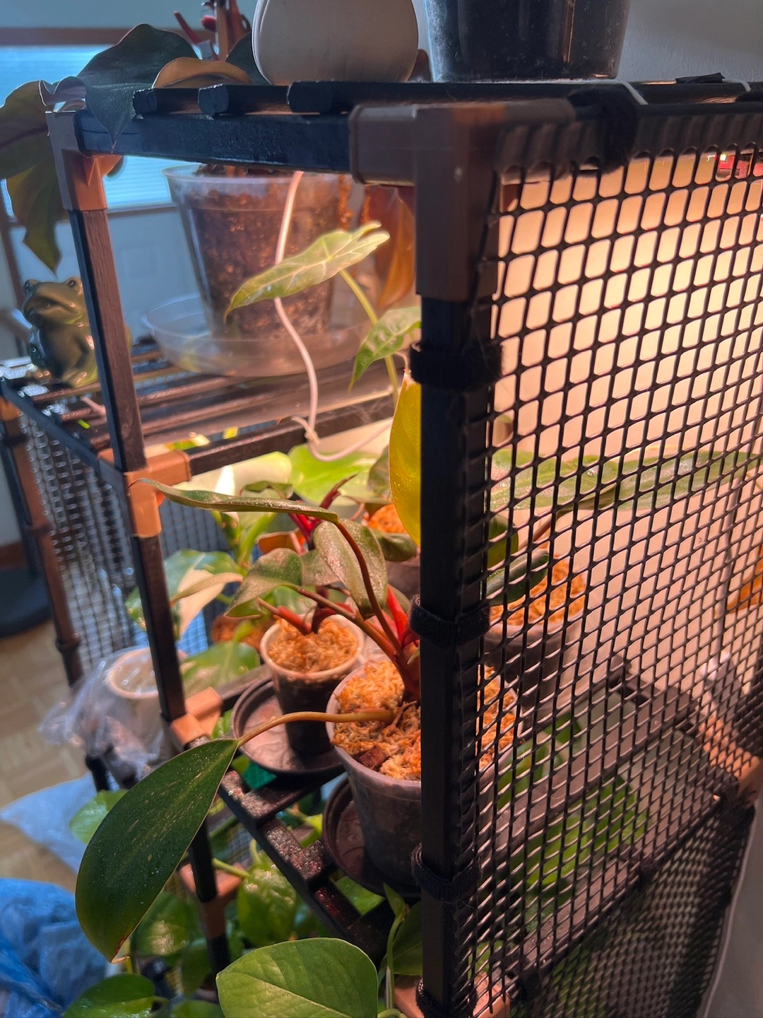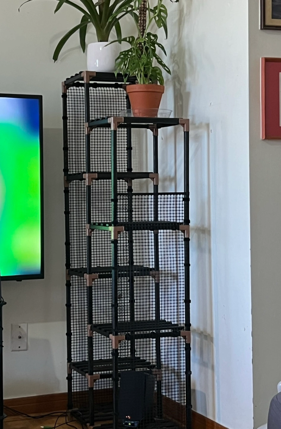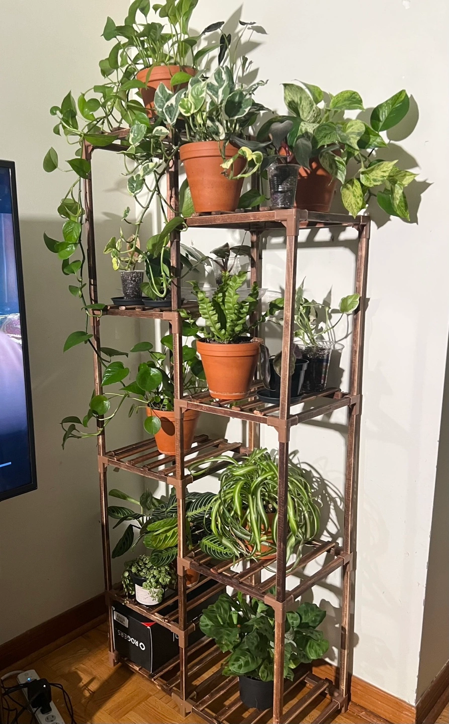This customized multitiered plant stand features a sleek black wood stain, giving it a modern, versatile look that suits any space. The sides have been uniquely fitted with removable netting, attached using Velcro straps for easy removal whenever desired. This added detail provides extra support and protection for your plants while maintaining a clean, functional design.