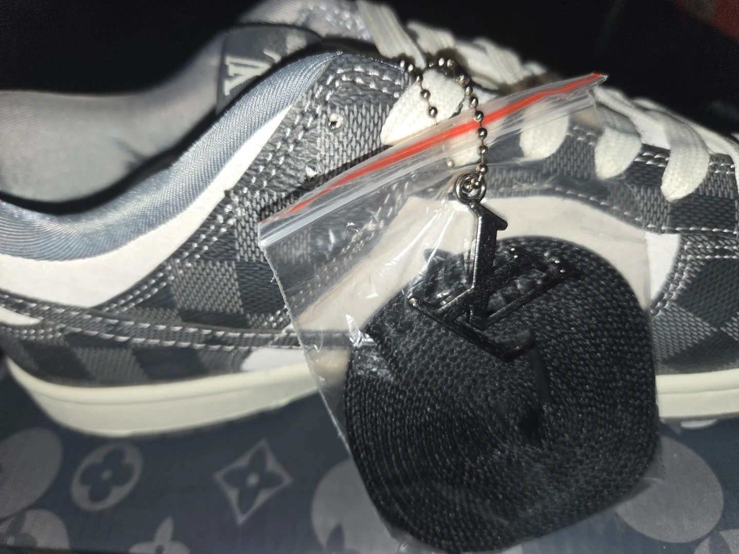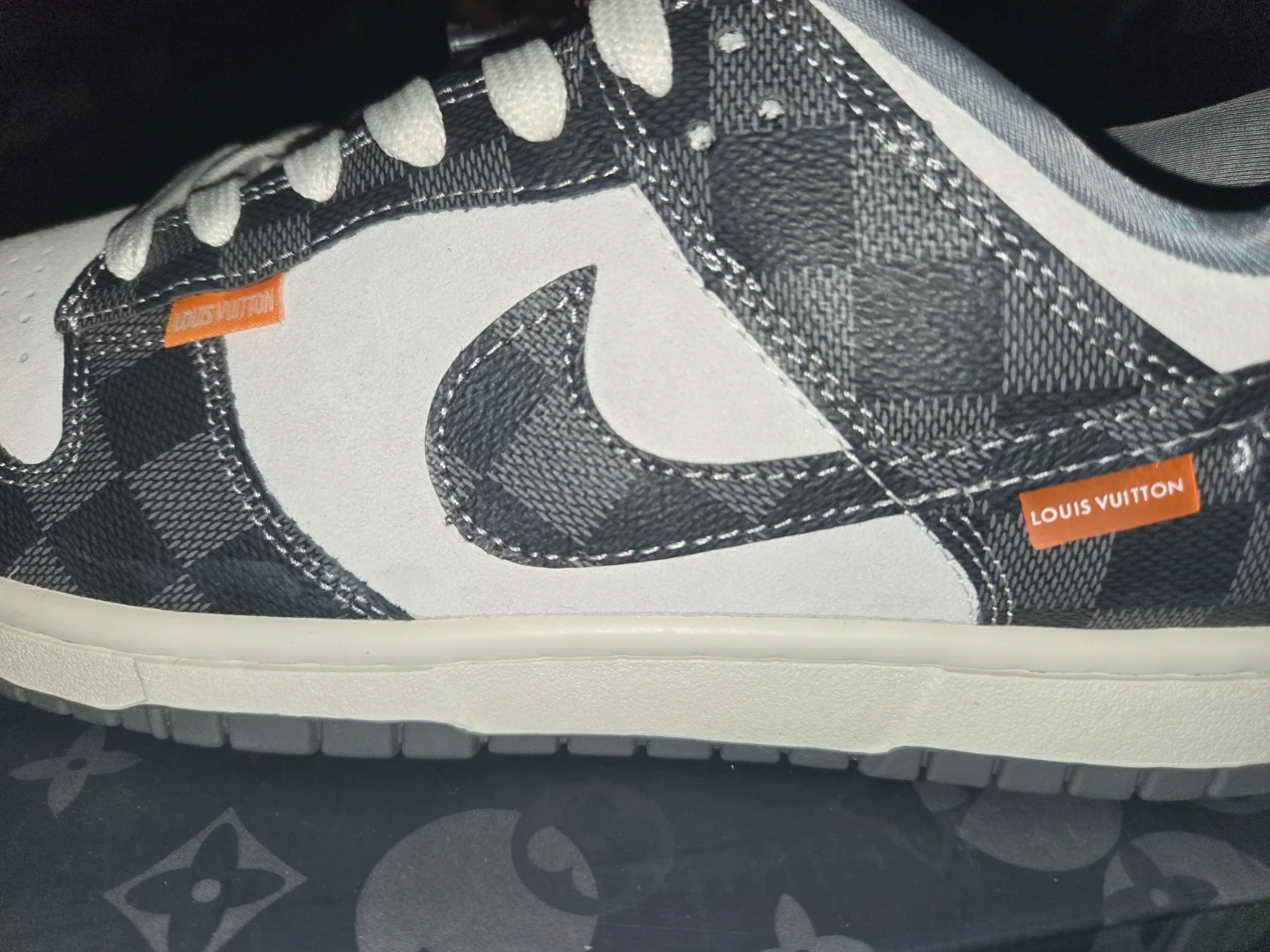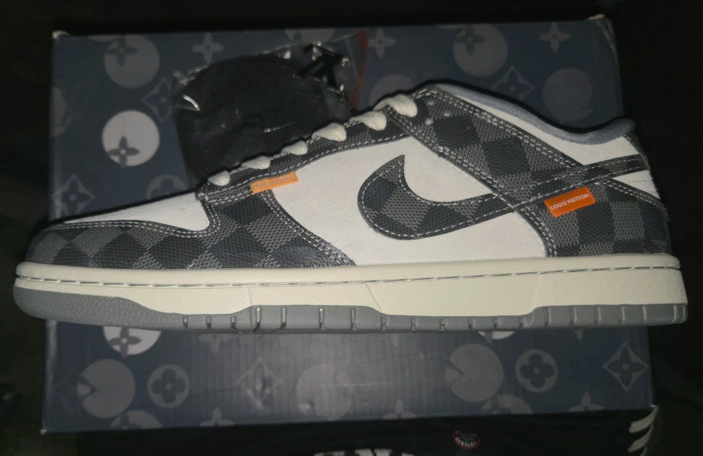 These Louis Vuitton x Nike Dunk Low sneakers feature a grey checkerboard pattern with white accents. They include extra black laces and a Louis Vuitton branded hang tag. These are a stylish choice for sneaker enthusiasts