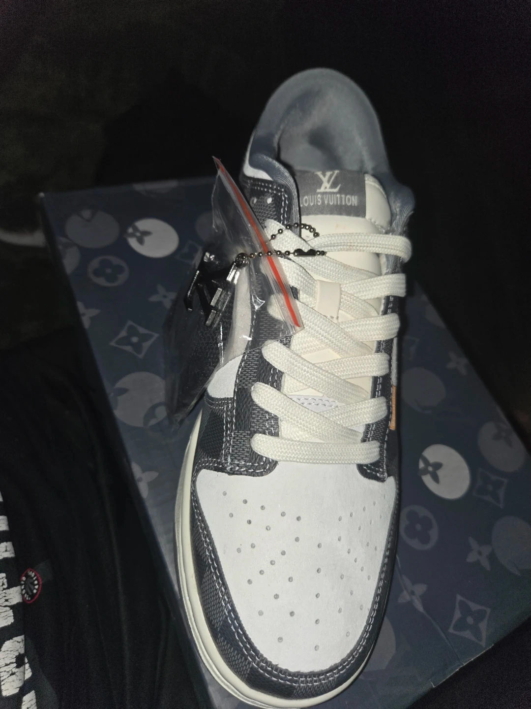 These Louis Vuitton x Nike Dunk Low sneakers feature a grey checkerboard pattern with white accents. They include extra black laces and a Louis Vuitton branded hang tag. These are a stylish choice for sneaker enthusiasts