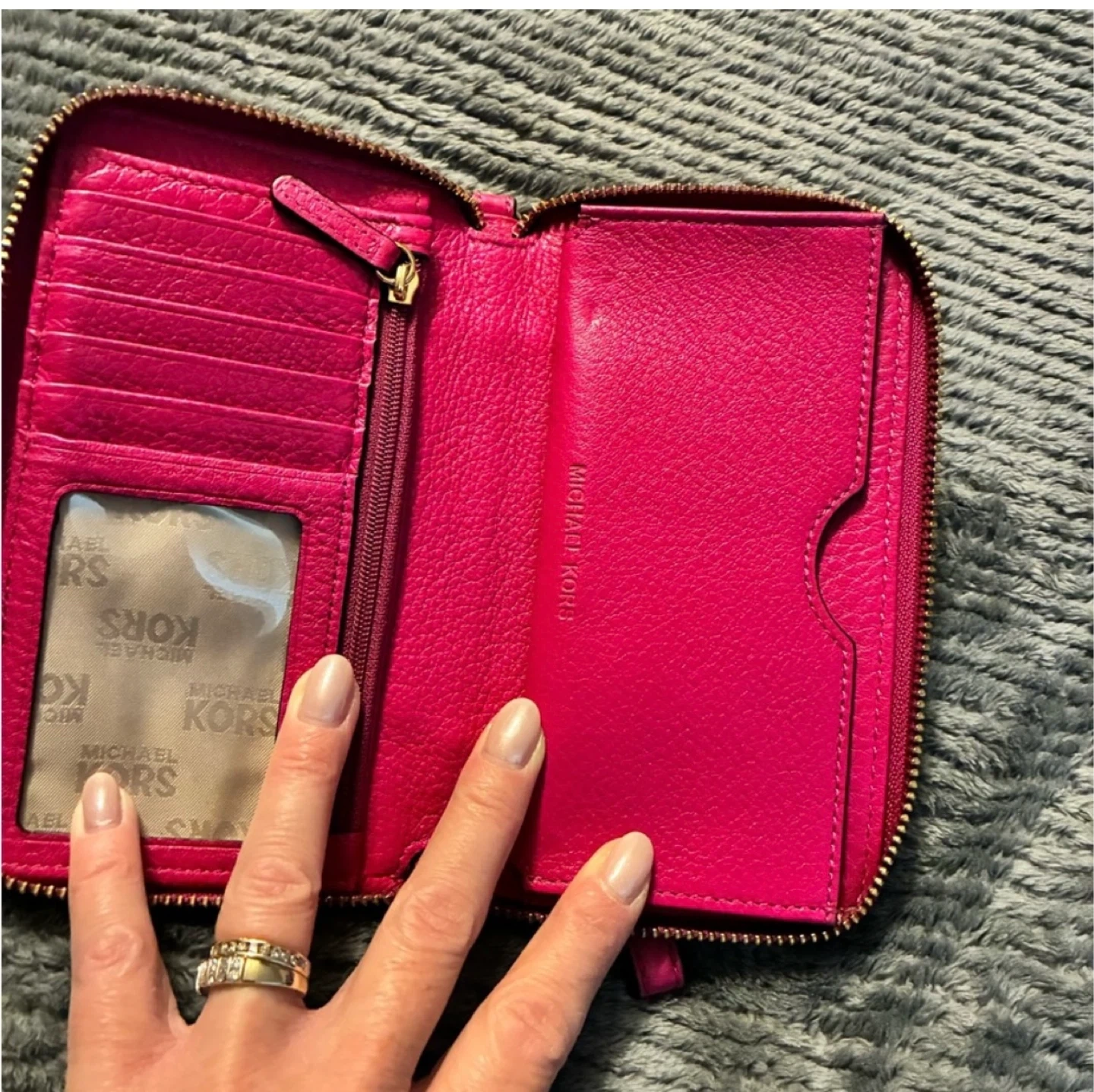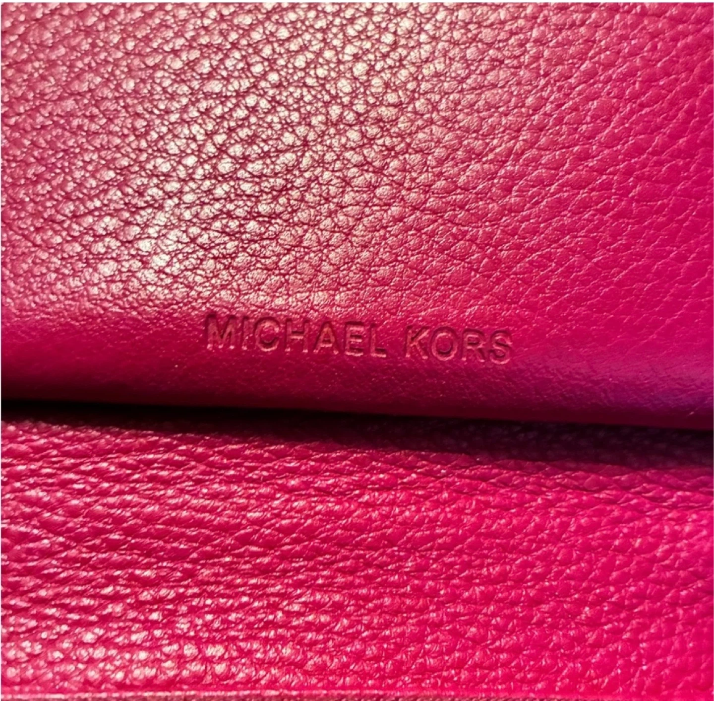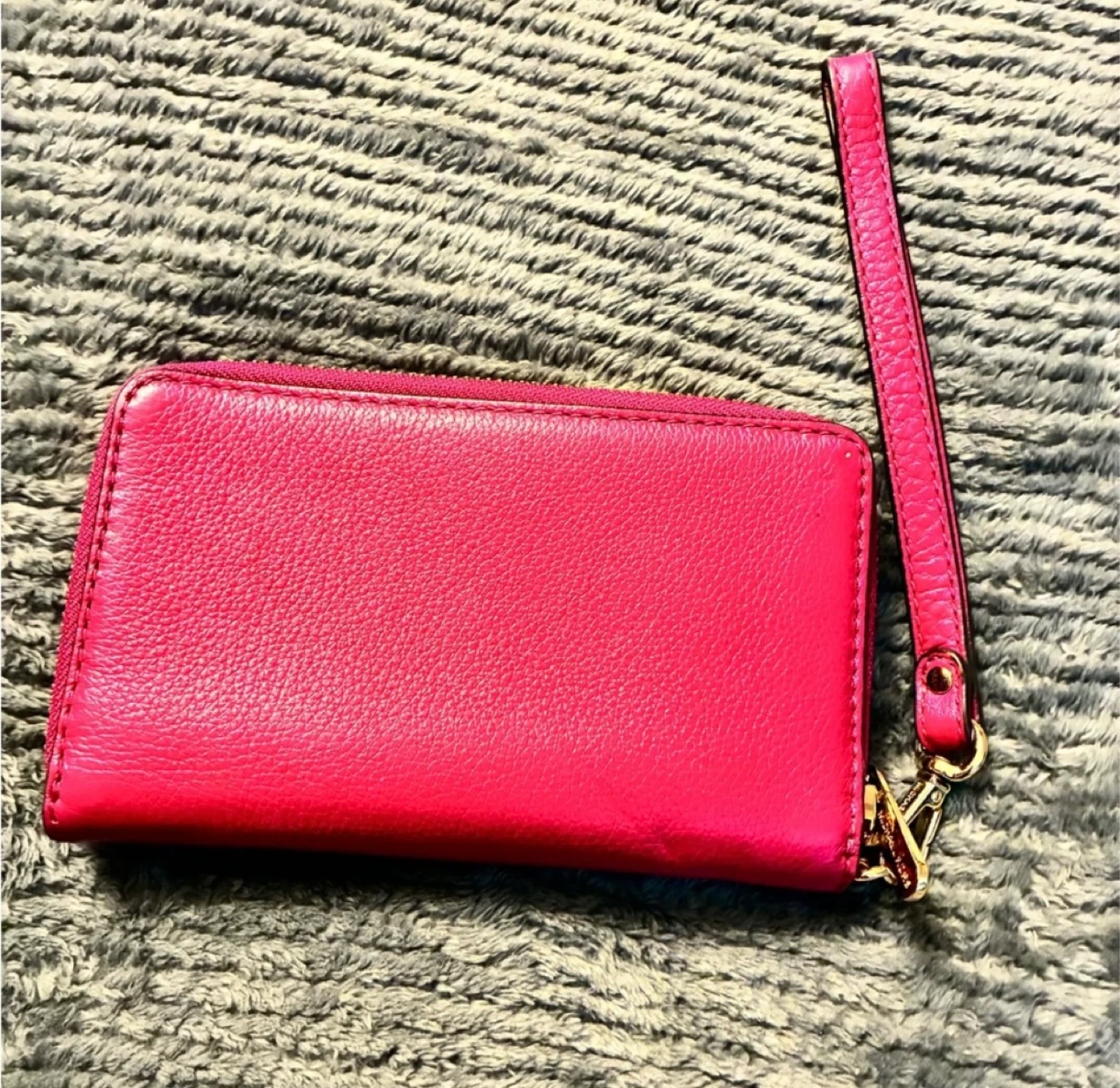 Michael Kors wristlet wallet in a vibrant pink colour. It's made of pebbled leather and features a zippered closure. Inside, you'll find card slots and a clear ID window. Includes a detachable wrist strap.