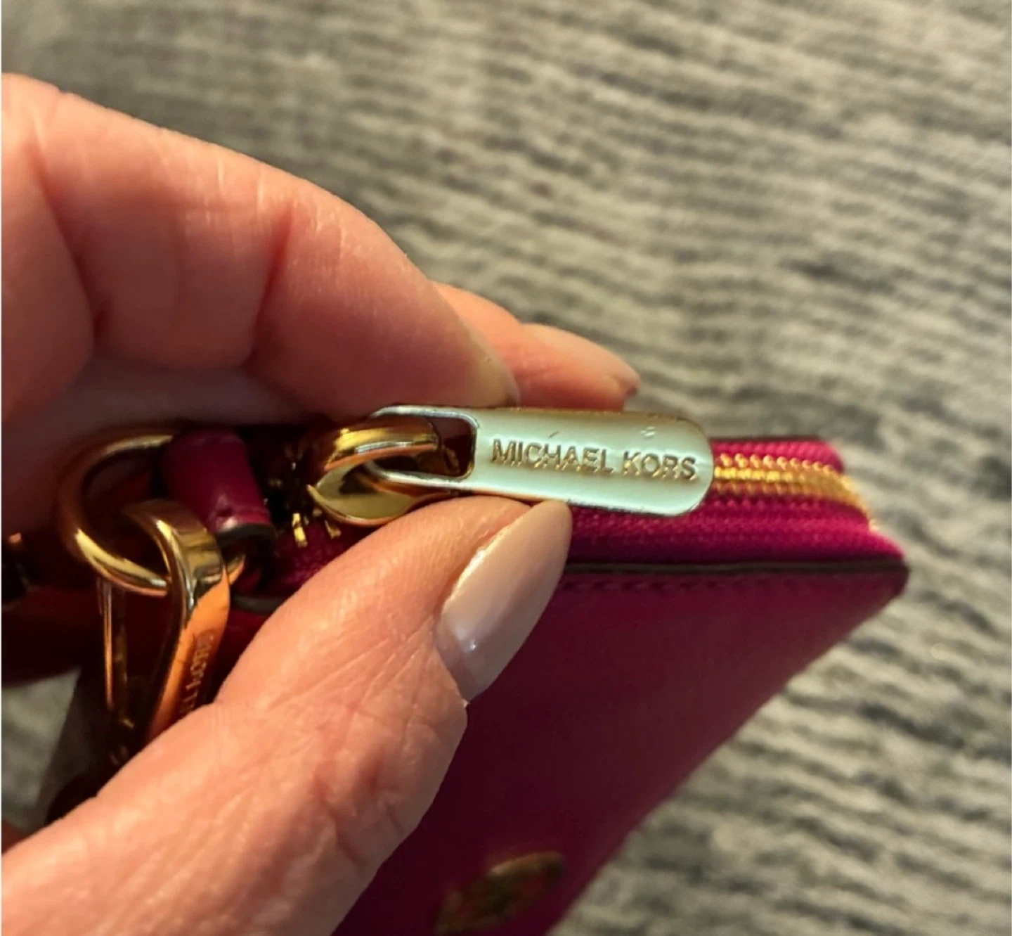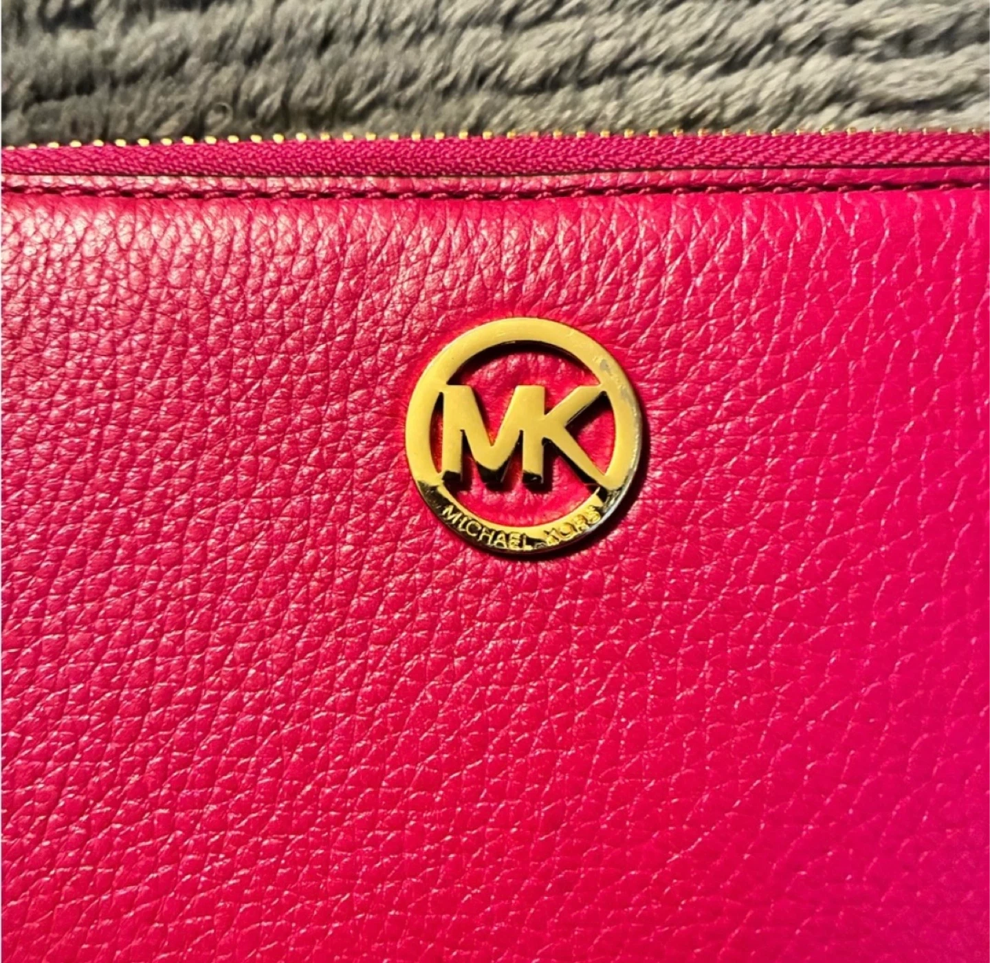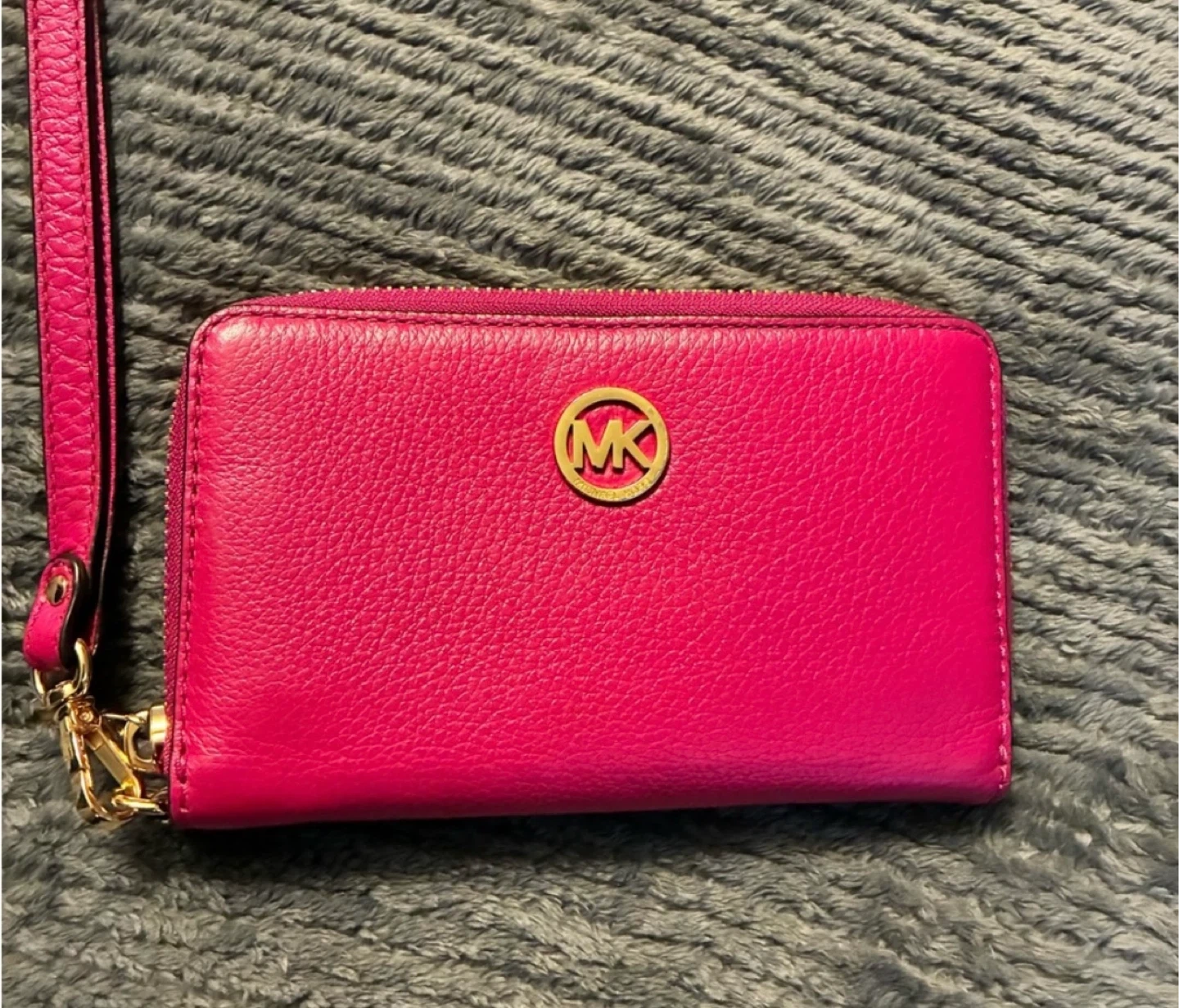 Michael Kors wristlet wallet in a vibrant pink colour. It's made of pebbled leather and features a zippered closure. Inside, you'll find card slots and a clear ID window. Includes a detachable wrist strap.