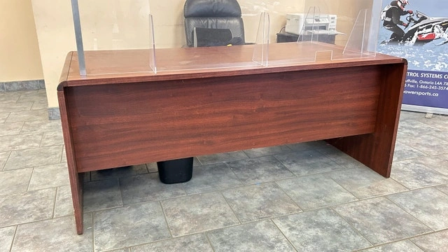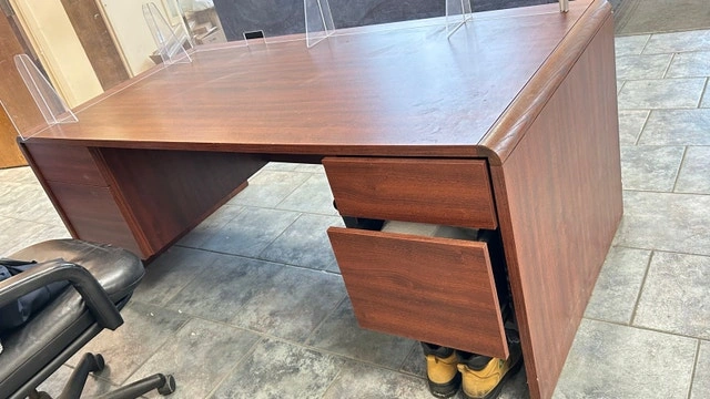 This is an office desk with a traditional design, featuring a wood-look finish and ample workspace. The desk includes drawers and a modesty panel. Although it's been used, it's still in good condition for all your office needs. Dimensions: 6’ x 3’ x 2.5’. This desk is ready to infuse a bit of 'retro chic' into your workspace. It's seen a few office adventures, but if this ad is up, it's still available for you to claim. Cash accepted.