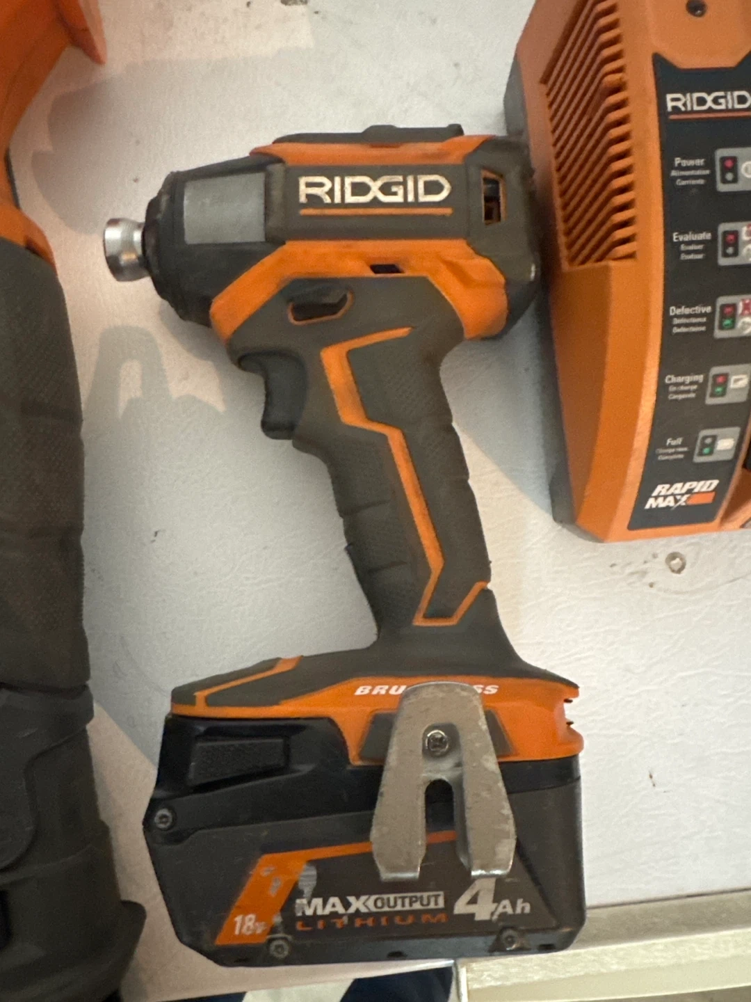 This is a set of RIDGID power tools. It includes a reciprocating saw, an impact driver with a 4.0 Ah battery, and a charger. The impact driver is brushless and operates on 18V.