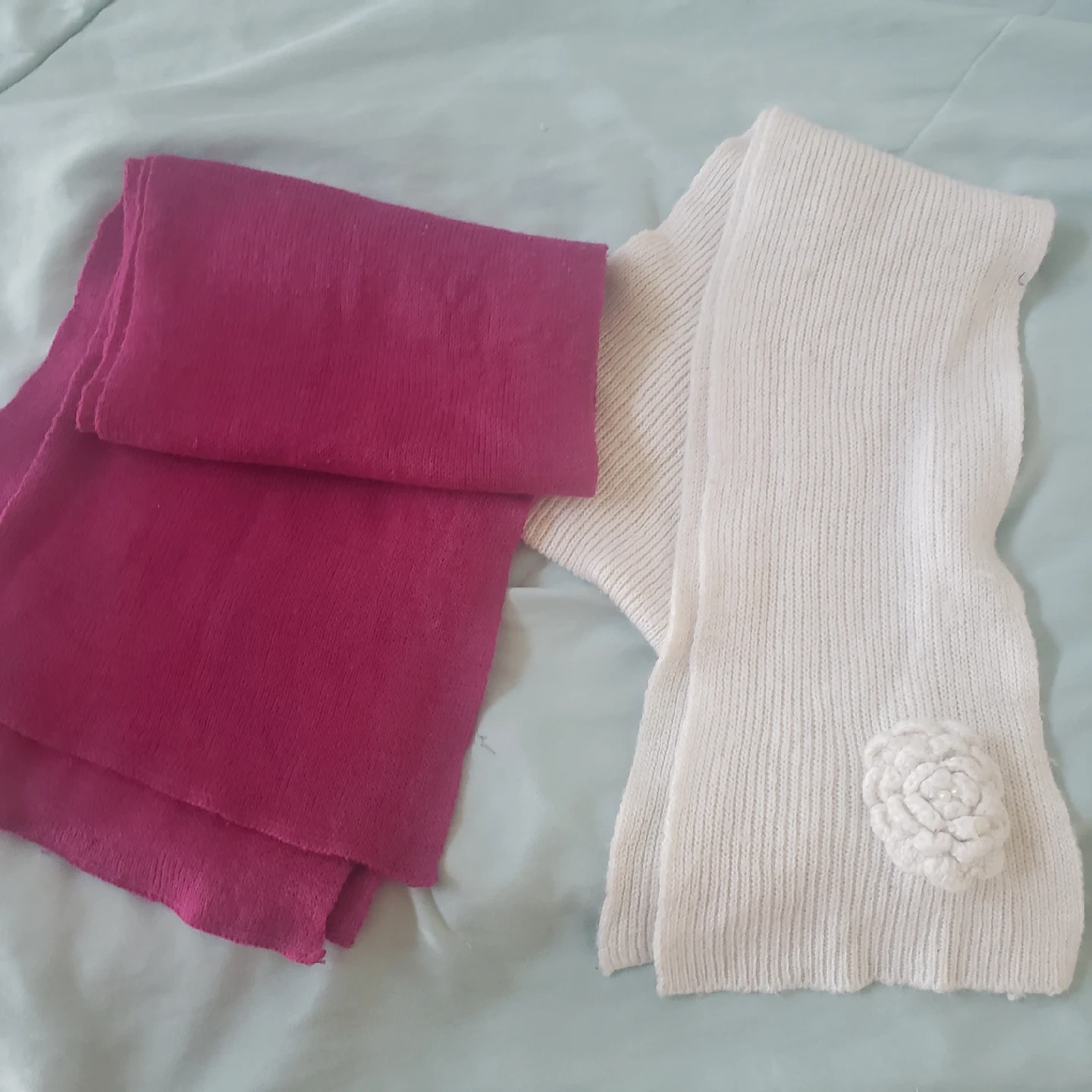 Two cozy scarves for sale! One is a vibrant pink knit, and the other is a cream-coloured knit scarf with a cute flower detail. Both are in great condition and ready to keep you warm this winter