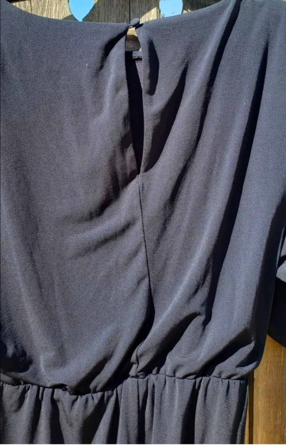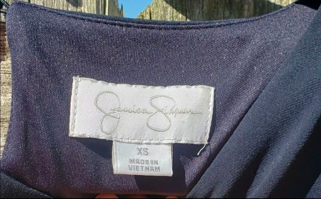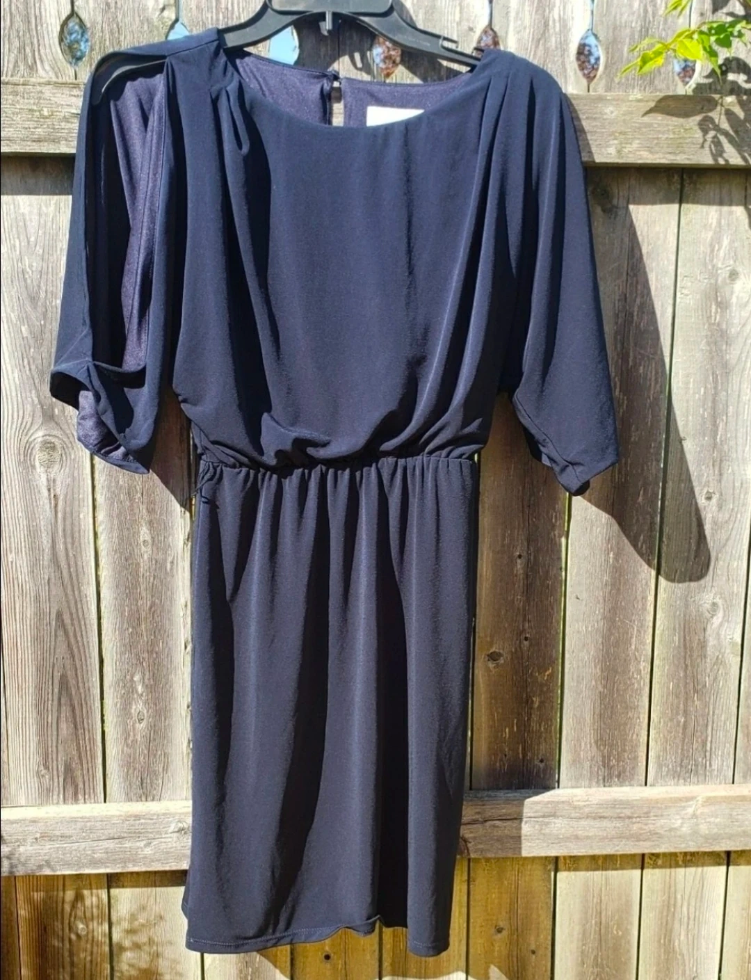 Jessica Simpson navy blue dress in size XS. It's made of a lightweight, flowy fabric. The dress has dolman sleeves and a cinched elastic waist.