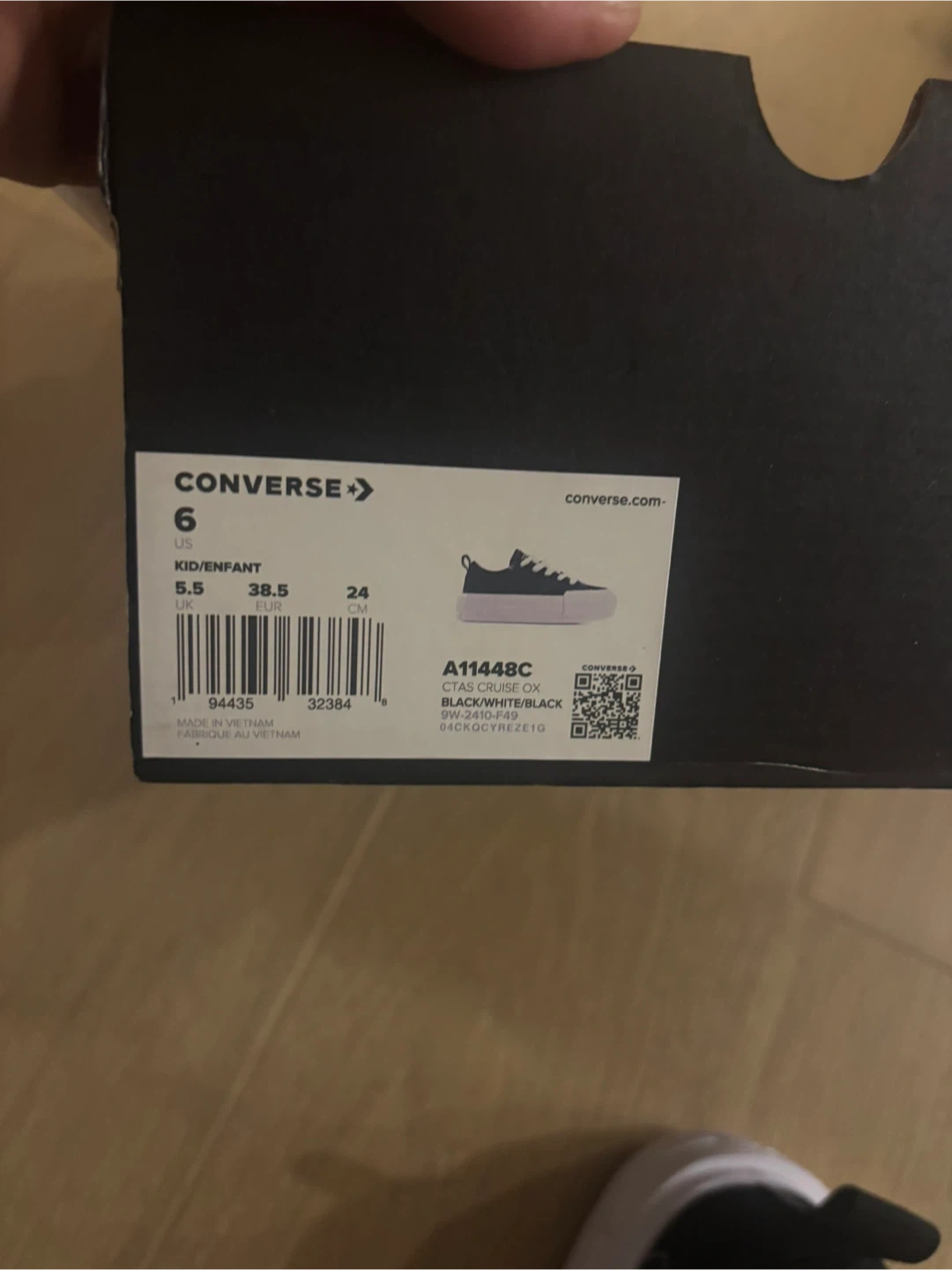 These are Converse sneakers in black and white. They're a kid's size 6 US what I bought to fit a ladies 7, but fit larger more of a ladies 8. Made with canvas material. Great for everyday wear! Brand new just delivered. Paid 65$