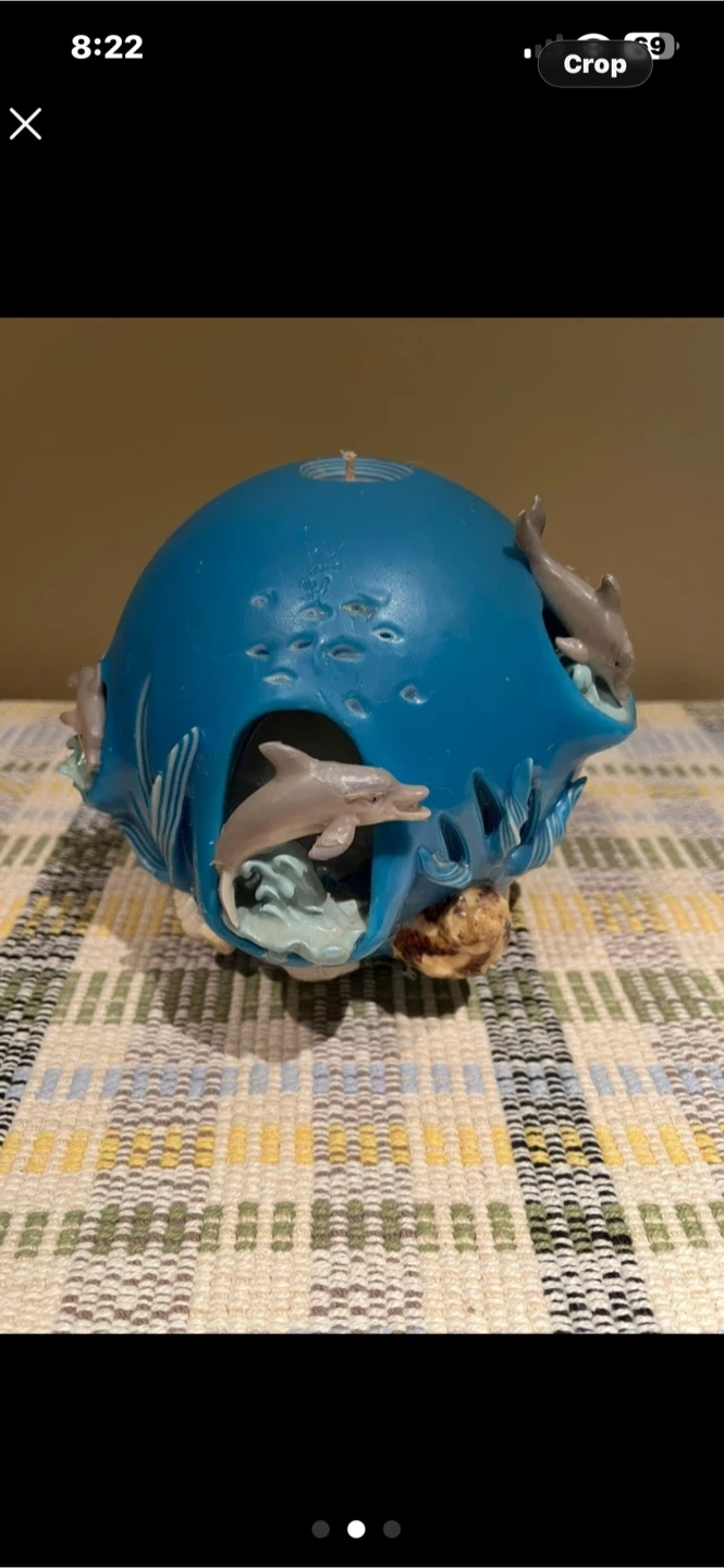 This decorative candle features a blue, orb-shaped design with dolphins and aquatic elements. It's a fun piece for any ocean lover.