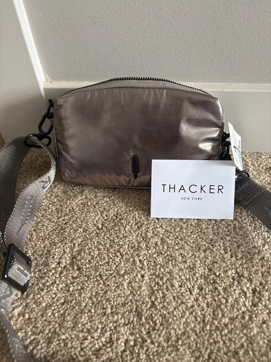 Metallic crossbody bag. Features a zipper closure. Adjustable strap. Perfect for everyday use for carrying your essentials, ensuring your comfort and convenience all day long. Tag is still on :)