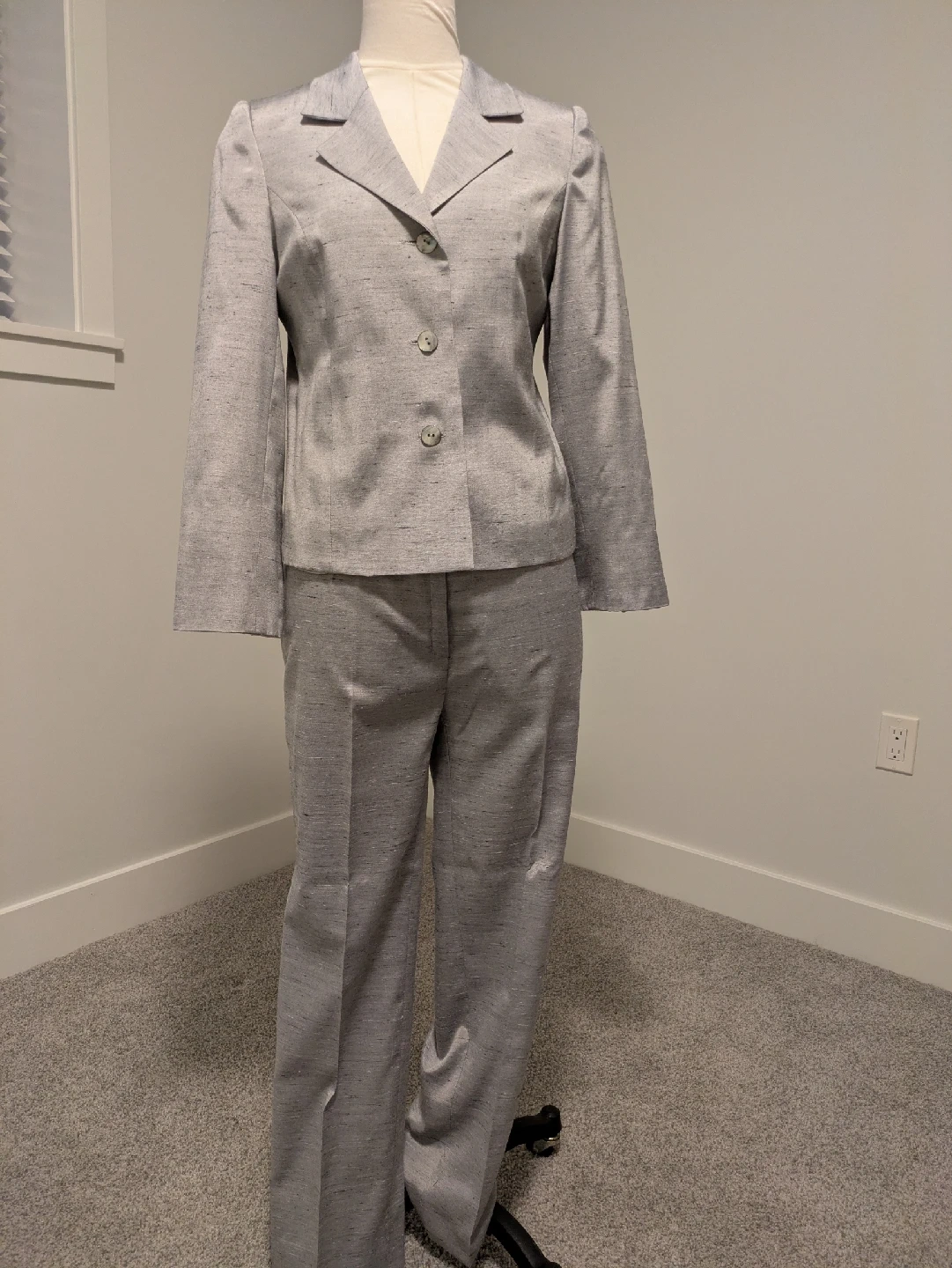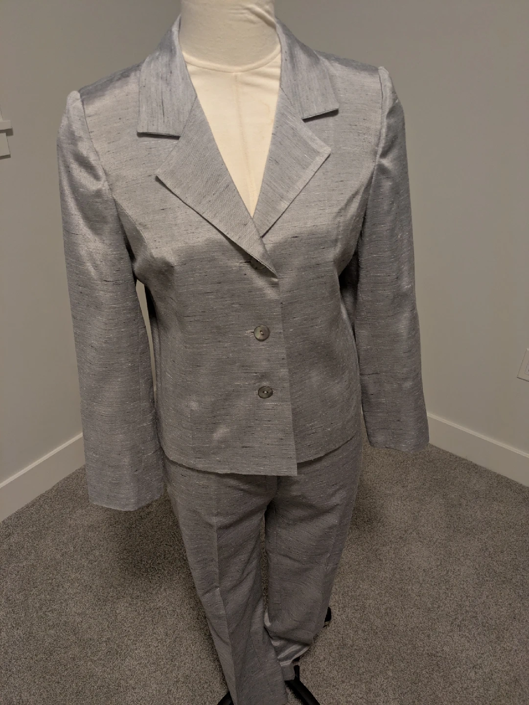 10Selling a Thai silk women's suit set in a lovely grey colour with elegant mother of pearl shell buttons. It includes a blazer and matching pants. The Thai silk material is exquisite. Perfect for business or formal occasions!