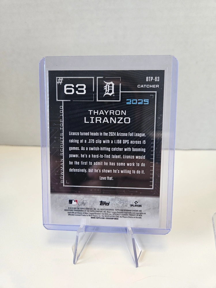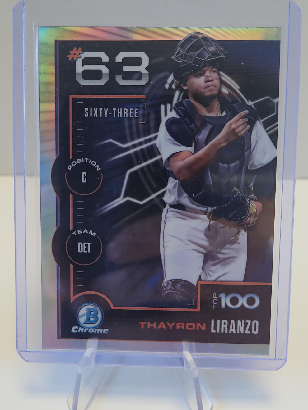 Selling a Thayron Liranzo Bowman Chrome baseball card! It's in great shape and features the Detroit Tigers catcher. He turned heads in the 2024 Arizona Fall League, with a .375 clip with a 1.158 OPS across 16 games. A great card for any baseball fan! Can also meet in Mississauga, Kennedy rd and Derry rd area during the week between 9am and 3pm shipping available at extra cost Check out my other listings