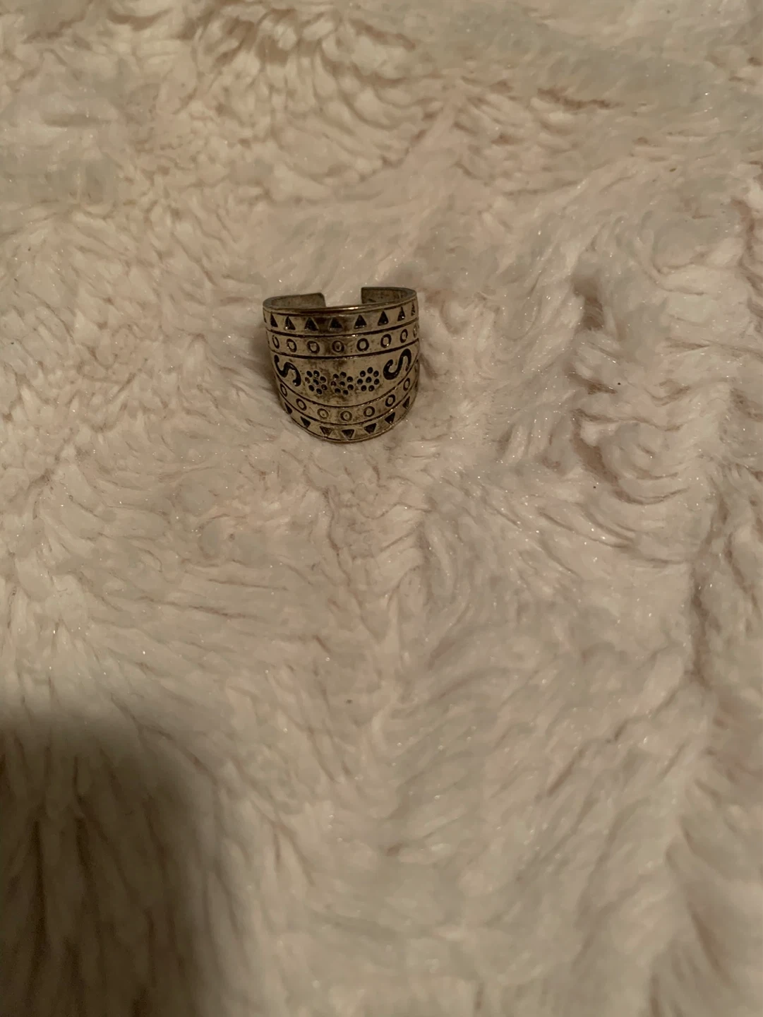 This ring has an adjustable band. It features a detailed pattern with small circles and triangles. A unique accessory for any outfit!