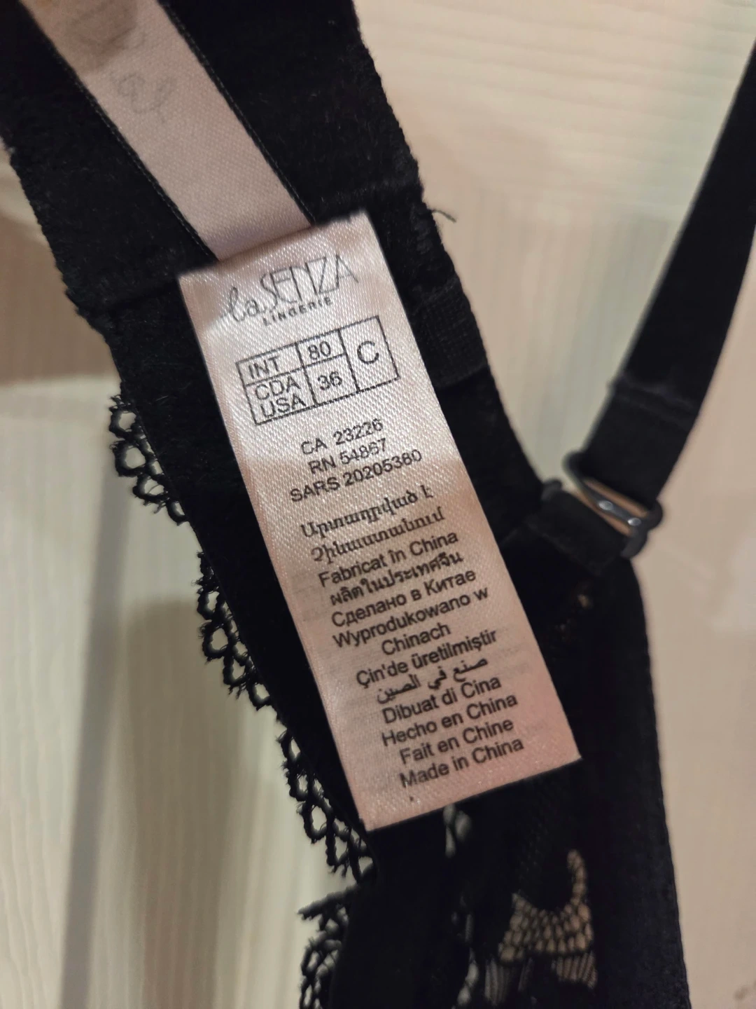 This black lace bra is from La Senza. It's designed with intricate lace detailing. The bra is a size 36C. Gently used. Price is firm.